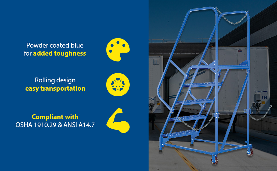 Semi-Trailer Access Ladders are for use getting into Semi-Trailers. Tilt the unit to allow for portability. Units roll on 4" poly-on-poly wheels. Constructed of square tubing framework which handles uniform capacities up to 350 lbs. Features 30" high removable hand railing, access chain, 21" deep top platform, and an industrial baked-in blue powder coat finish for toughness. Each step measures 24" wide by 7" deep and is spaced 10" apart. Climb Angle is 58 degrees. |