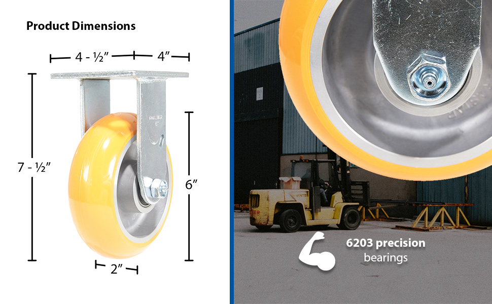 Constructed of proprietary, high-grade elastic polyurethane and coupled with 6203 premium precision ball bearings for added strength and durability. The upgraded tread provides a longer life, reduces the force required for movement, rejects debris, and offers exceptional floor preservation. Orange tread color. 85 shore a. Wheel core is constructed of high-grade, light-weight, water resistant aluminum.