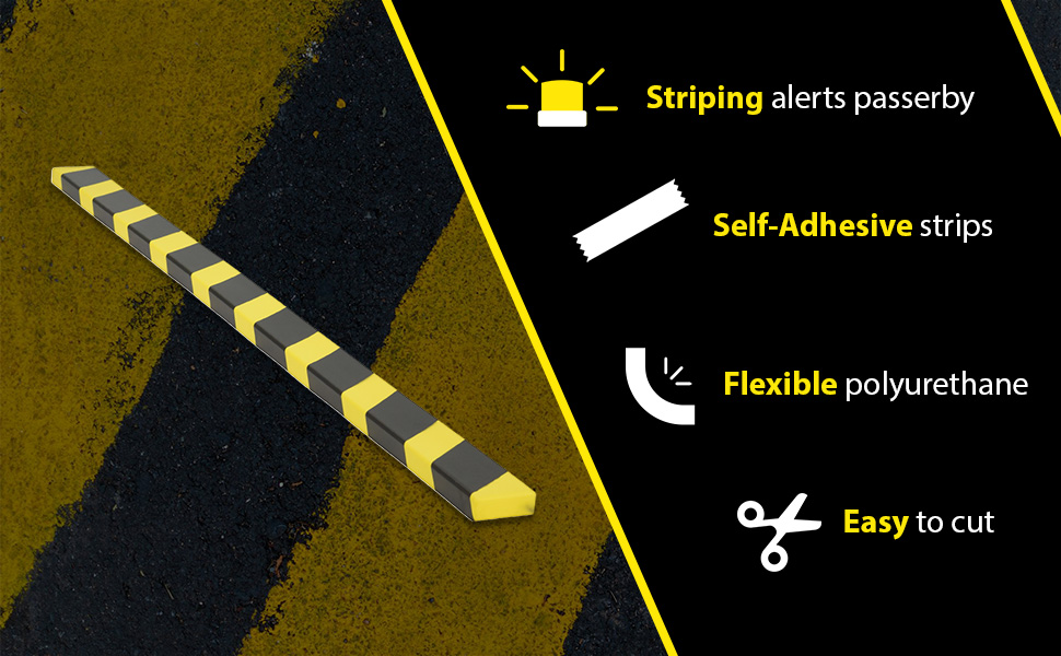 Versatile foam edge guards provided added protection when necessary. Each guard is manufactured from flexible foam that conforms to slightly irregular angles and surfaces Black and yellow alert striping. Sold in lengths of 40", easy to cut to custom lengths. Mounts with self-adhesive strips. Includes double sided tape for adhering.