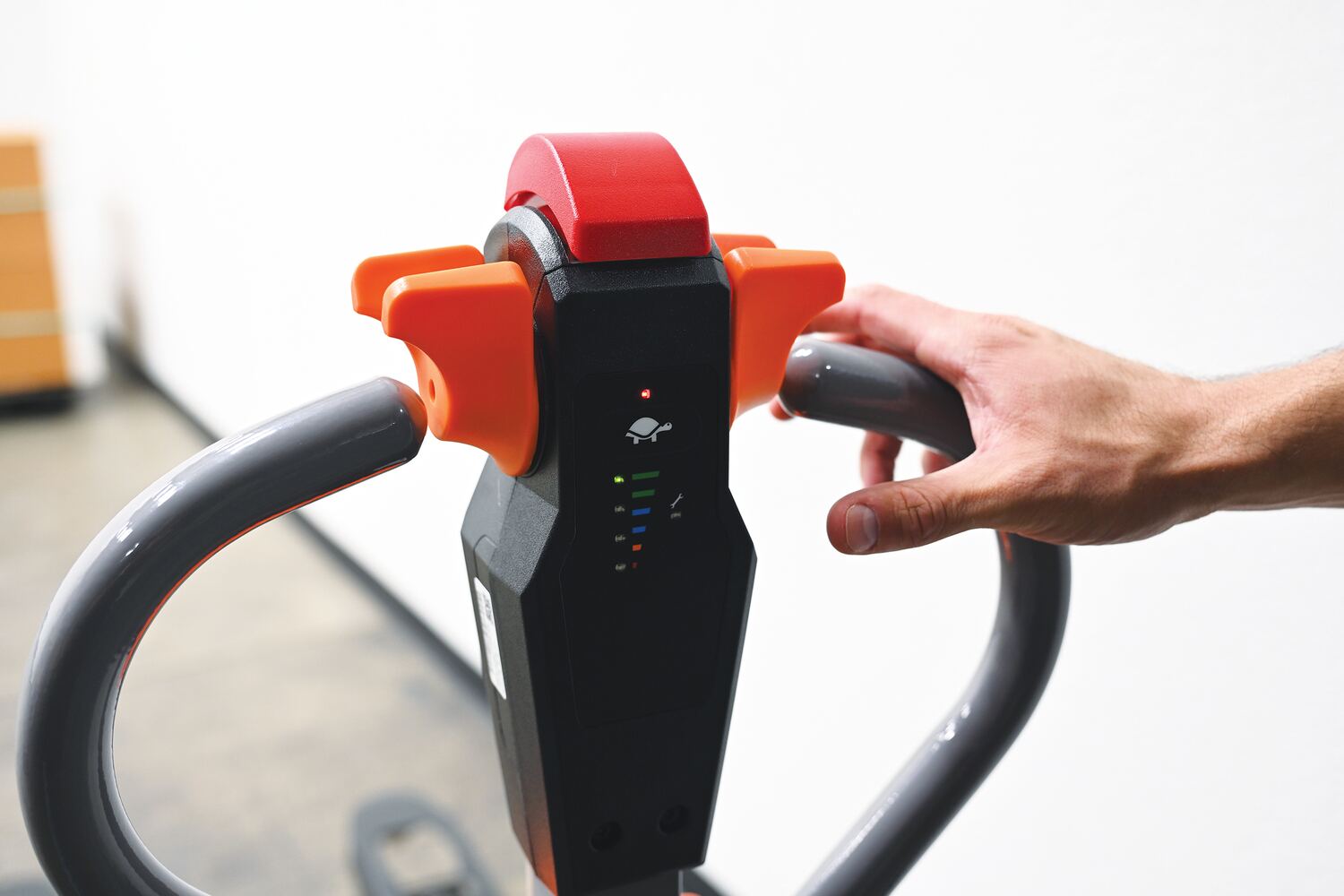 Steel Electric Pallet Truck With Powered Brakes 27 In. x 45 In. 3,300 Lb. Capacity Black/RedThe electric pallet truck is the perfect change from the manual design. This construction design is built to last, withstand rugged daily use, and diminish manual labor. Multi-function capabilities such as the raise and lower buttons and emergency brake are located in the handle. The design of the handle is also ergonomically friendly, minimizing awkward slouching when maneuvering. All areas are easily accessible for general upkeep and cleaning. Truck can be used with the handle in the upright position for utilization in the small areas. Horn is also included. This model includes powered brakes, which lessens strain on workers and increases workplace safety.