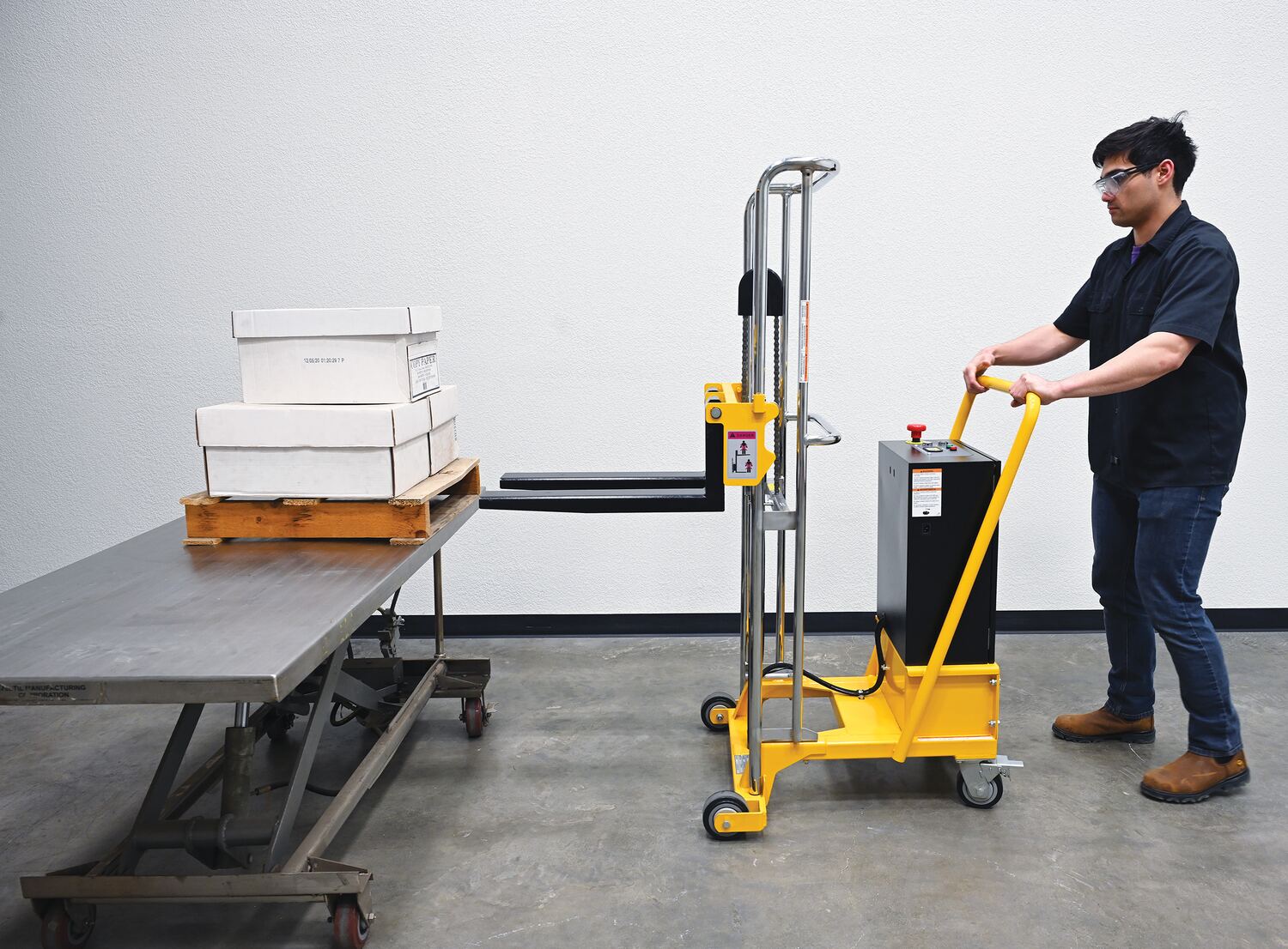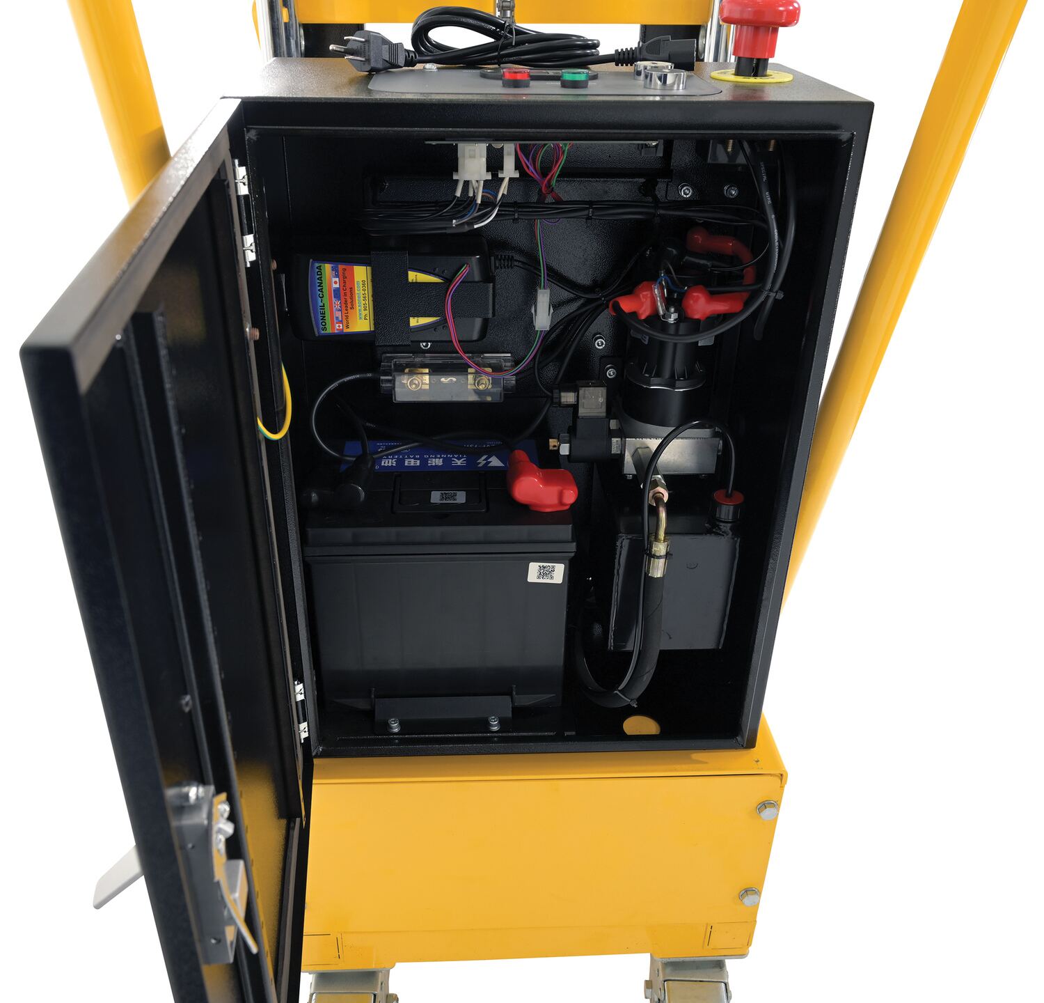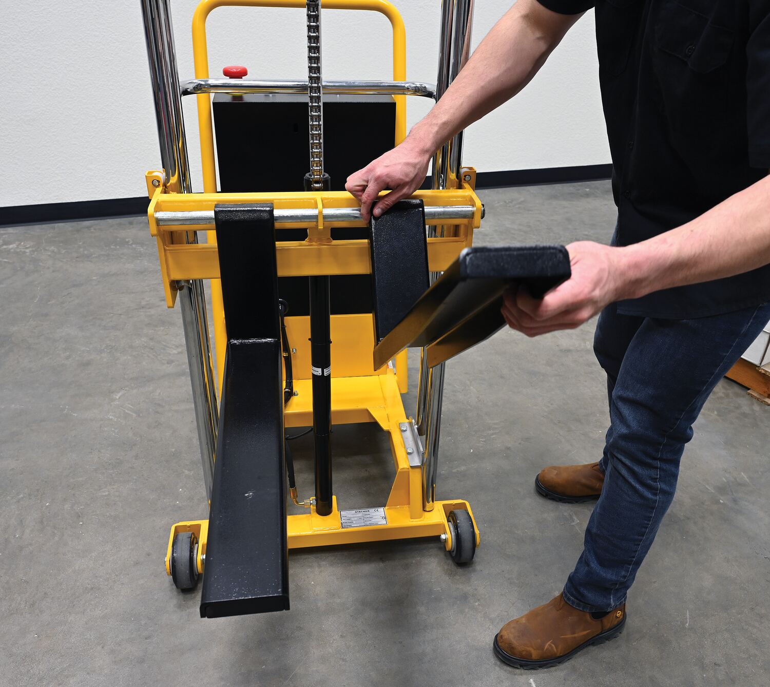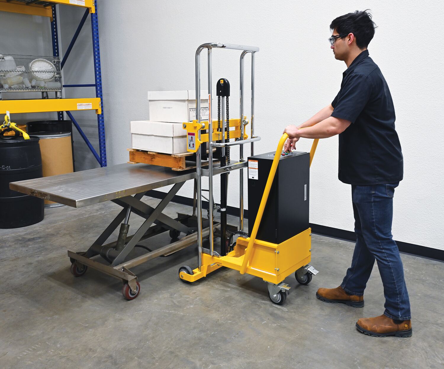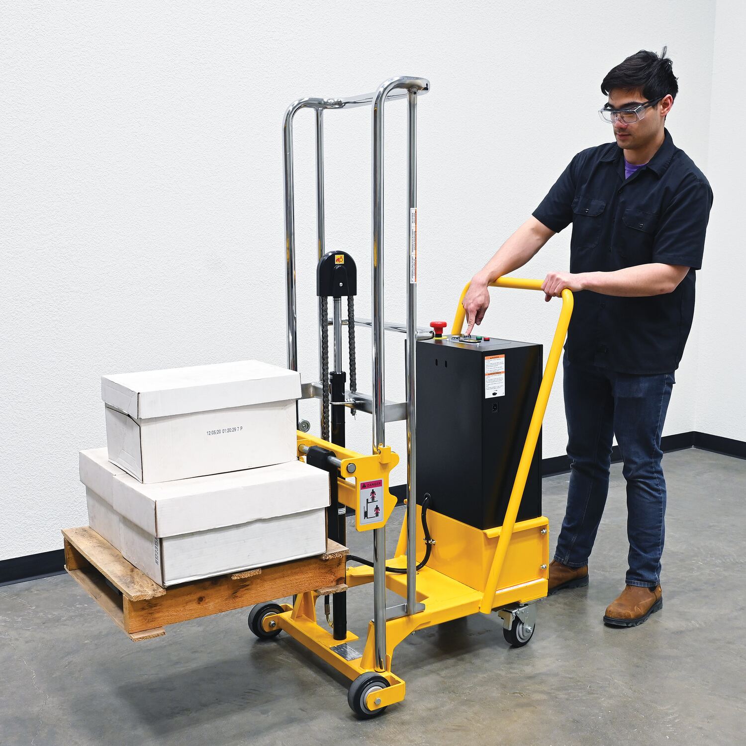 Steel Counter Balanced Hefti-Lift 68 In. x 68-3/4 In. 550 Lb. Capacity Yellow / BlackDC powered portable hydraulic lifts are user friendly providing reliable, powerful lifting when moving and positioning loads. Units roll easily on two rigid and two swivel poly-on-steel casters and include a foot operated brake. Not for use with pallets. All welded steel construction with chrome uprights. Variety of attachments available.