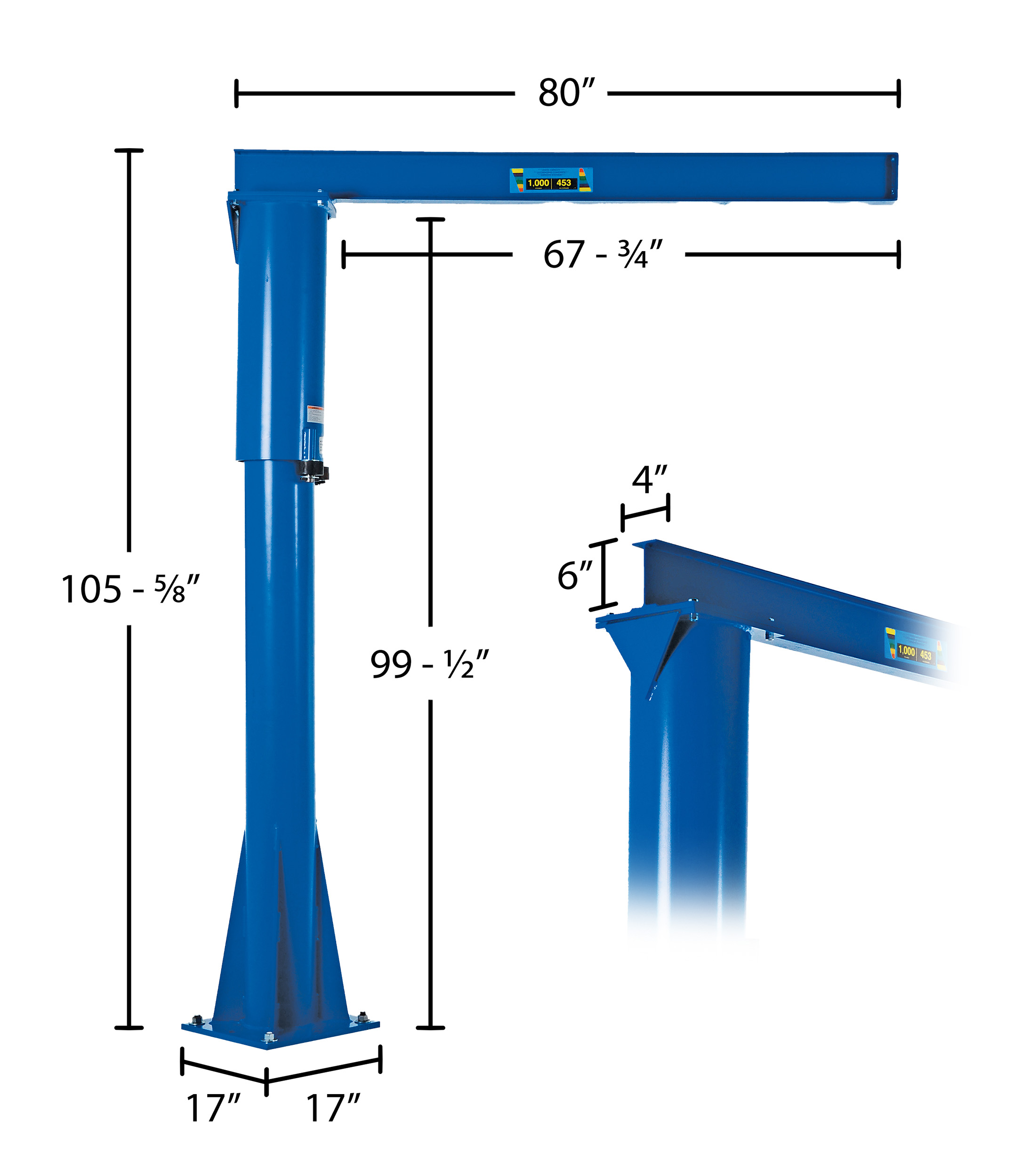 Steel Floor Mounted Jib 80 In. I-Beam 1000 Lb. Capacity BlueThis floor mounted jib adapts well to a variety of applications. With the unique design, the jib is functional in any direction for complete customization of the work station. Solid steel construction will assist workers in lifting awkward material. Hoists & Trollies can be ordered separately.