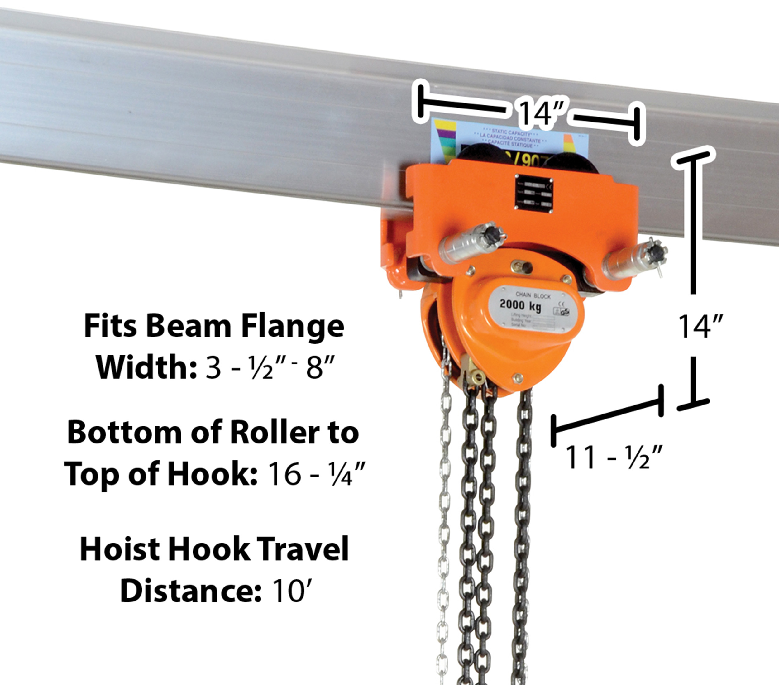 Steel Low Headroom Chain Hoist Push Trolley 14 In. x 11-1/2 In. x 14 In. 4,000 Lb. Capacity OrangeUse this low headroom Chain Hoist geared trolley to gain additional raised hook height. Chain hoist hook travel is ten (10) feet. Fits on wide flange or S-type I-beam.