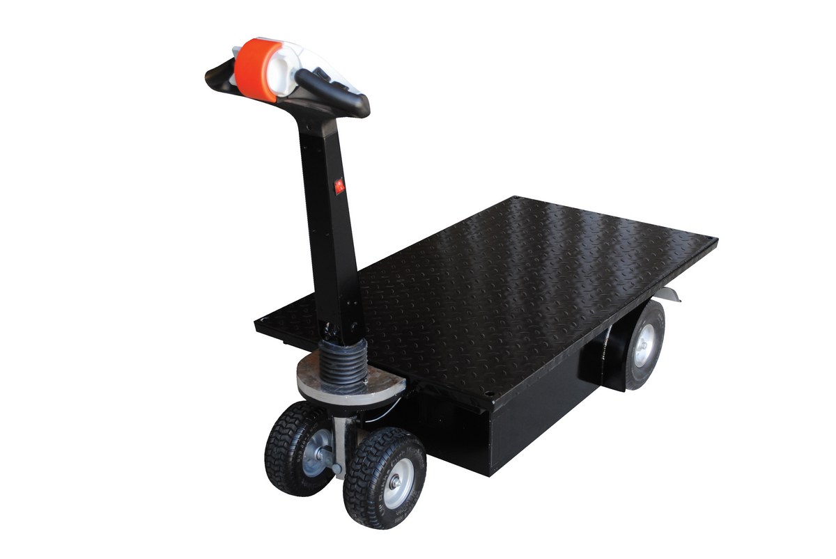 Unique carts feature built-in traction-drive system for easy transportability. Ideal for applications including mail rooms, hospitals, supermarkets, hotels and warehouses. Features 500W electric drive motor with two 70Ah batteries for power. 110V AC internal battery charger is included along with battery level indicator. Variable throttle speed control for precise maneuvering and positioning is located in the handle. Units roll smoothly on (2) 9" x 3-1/4" solid foam rubber steering wheels and (2) 10" x 3-1/4" solid foam drive wheels. Walking speed is 0-2.8 mph when unloaded and 0-1.5 mph when loaded. Speed control is conveniently located in handle. Handle pivots back towards operator and includes horn and emergency stop. Maximum incline is 7 degrees. Each shelf includes a tread plate surface. Deck height 14"