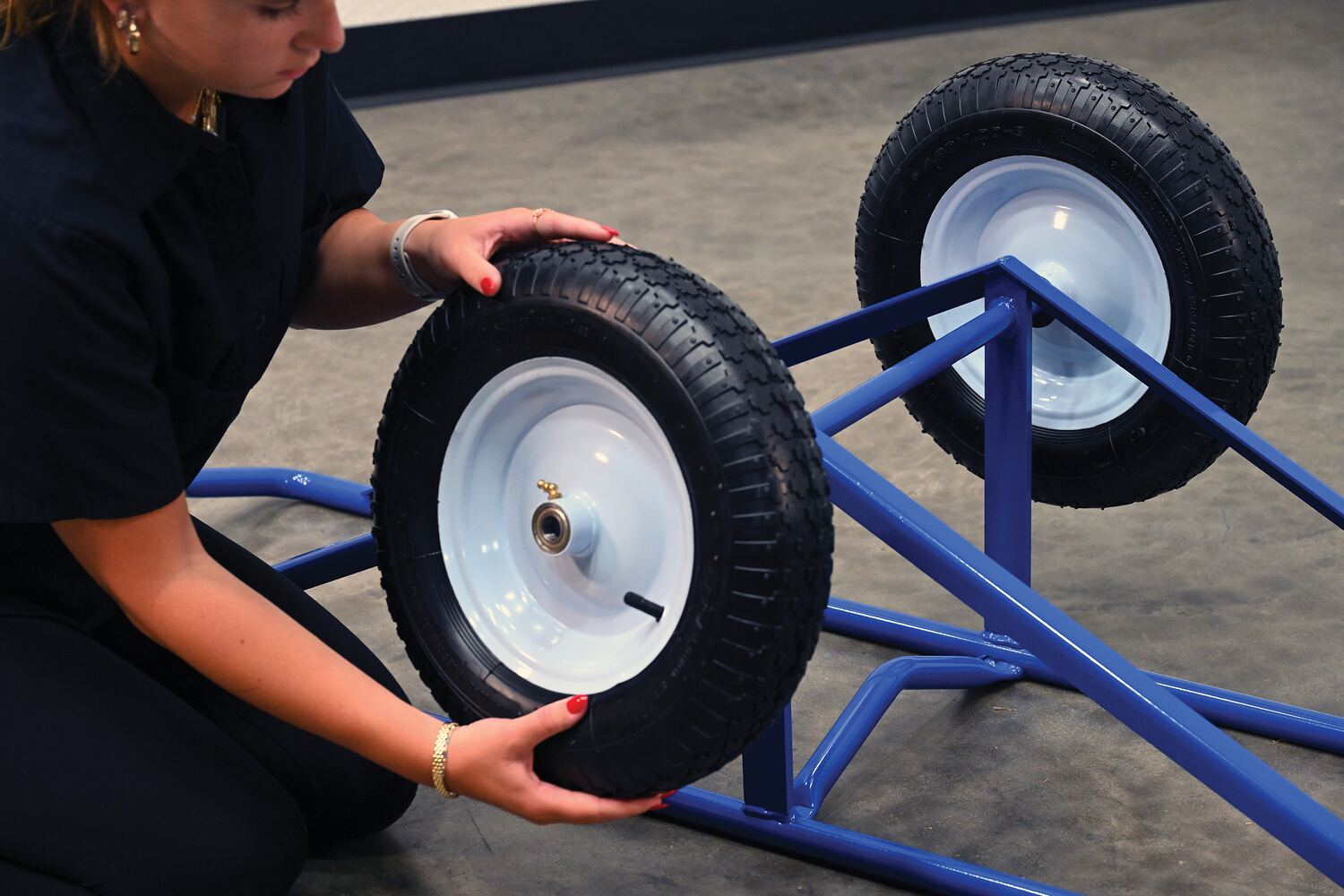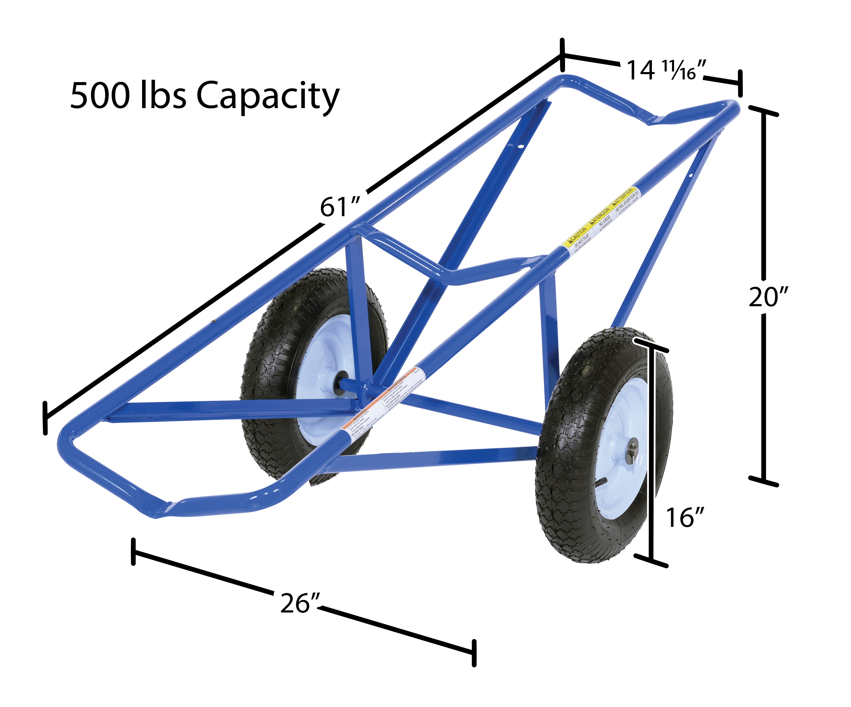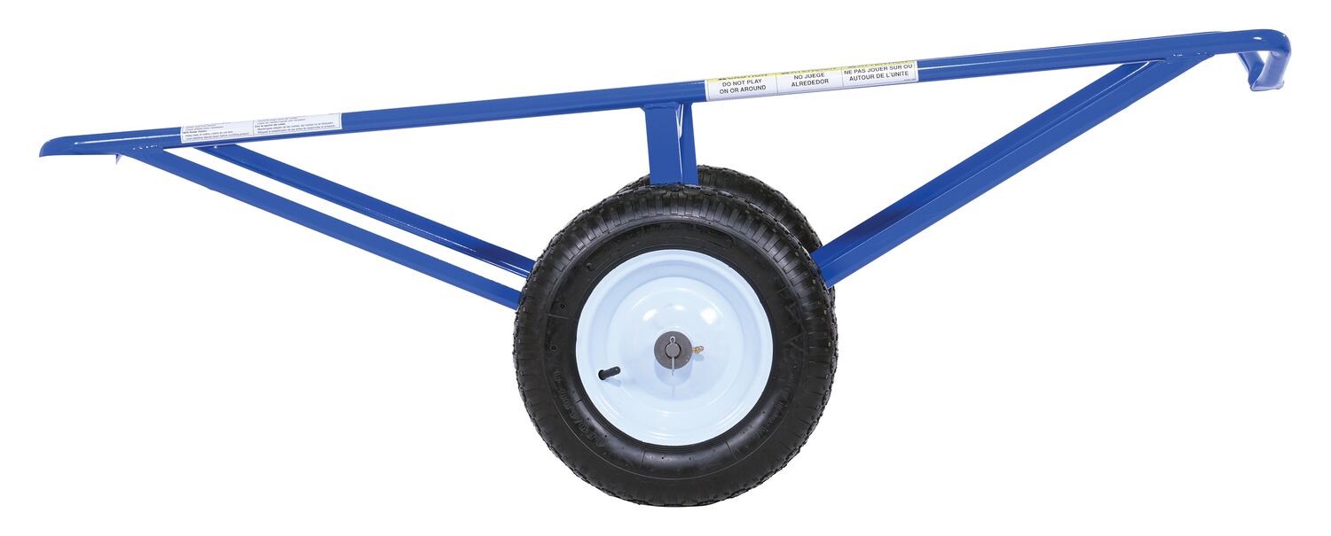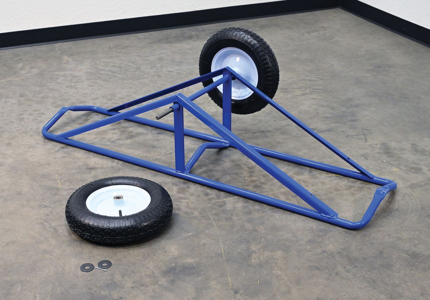 Each unit includes two 16" diameter by 4" wide wheels. Uniform capacity 500 lbs. Welded steel construction with baked in powder coat blue finish.