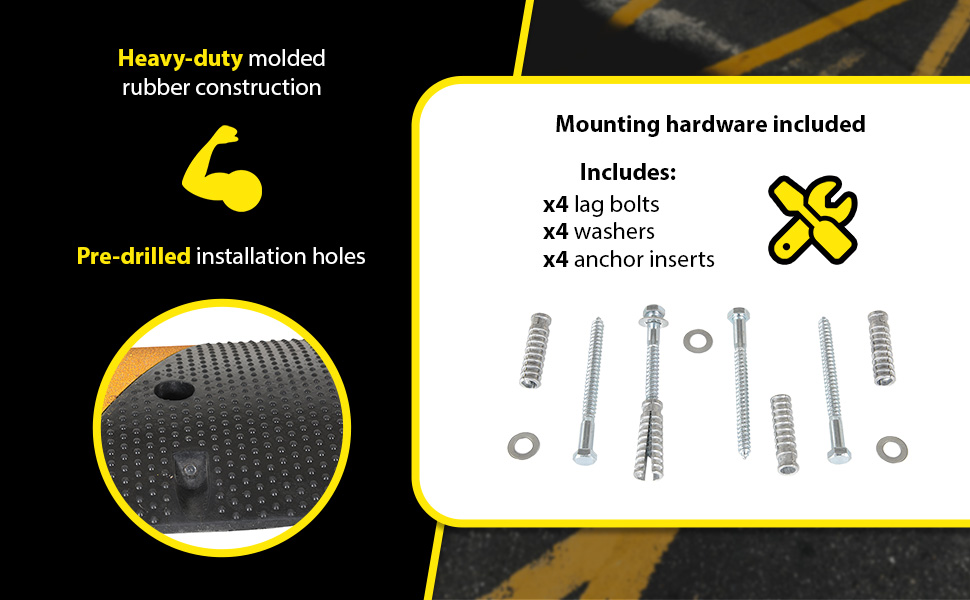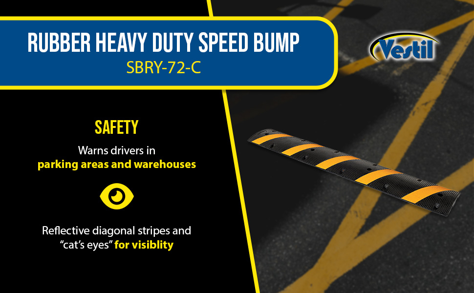 SBRY seriesHeavy-duty molded rubber construction for durability. Rubber includes UV stabilizer for longer life. Features five reflective yellow diagonal strips and "cats eyes" per side for better visibility. Four mounting holes per speed bump, hardware included. Maximum capacity is 40,000 pounds. End caps are available separately.