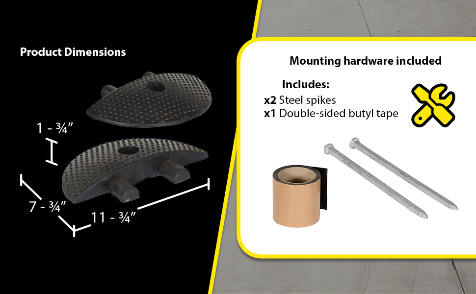 SBRY-CAP-A SBRY-CAP-ARubber Heavy Duty Speed Bump Asphalt End Caps BlackPackage Contents: (2) End caps, (2) asphalt spikes, (1) roll of butyl tape