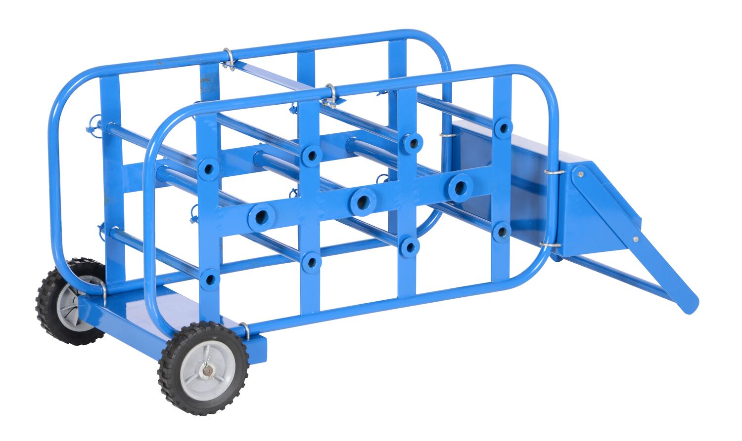 Move wire reels and dispense wire in vertical and horizontal position. Caddy includes eleven (11) spool bars for handling various size reels. Three (3) large 1-1/6" diameter axles handle 14" maximum reel diameter while the eight (8) smaller 3/4" diameter axles handle 7" maximum reel diameter. Storage tray on top for added versatility. Portable with 6" diameter semi-pneumatic wheels and 43-1/2" high handle. Total uniform capacity is 150 lbs. (90 lbs. on large spindles and 60 lbs. on small spindles). Steel construction with painted finish. Ships knockdown.