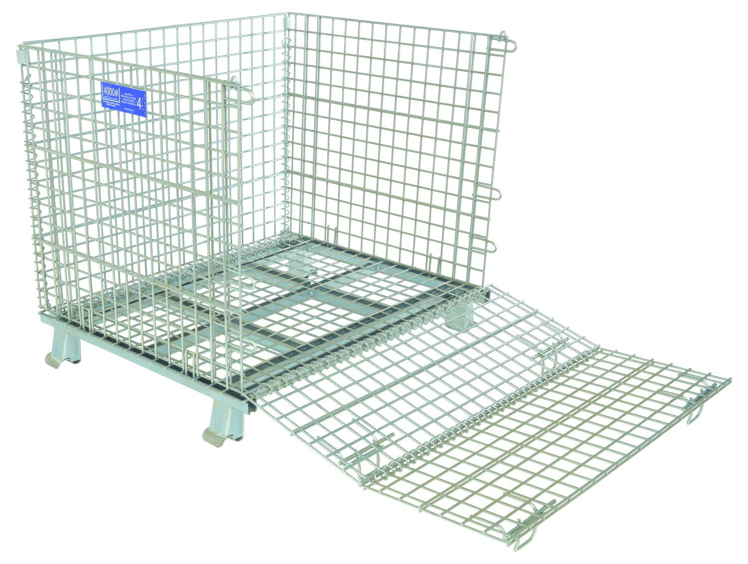 All steel construction available is either 3-gauge, or 11-gauge galvanized welded wire mesh. Corners have eyelets designed for rigidity and stacking. Legs are wrapped and welded around base to eliminate sharp edges. Containers can be stacked 4 high and have a 4" clearance underneath to allow movement by fork or pallet trucks. Container's front half drop gate allows speed loading and access to stored goods. The collapsible design allows for efficient storage and transportation. If you are in the need for an open wire design that allows for full visibility for inventory checks, ventilation and cleanliness then this is the product for you.
