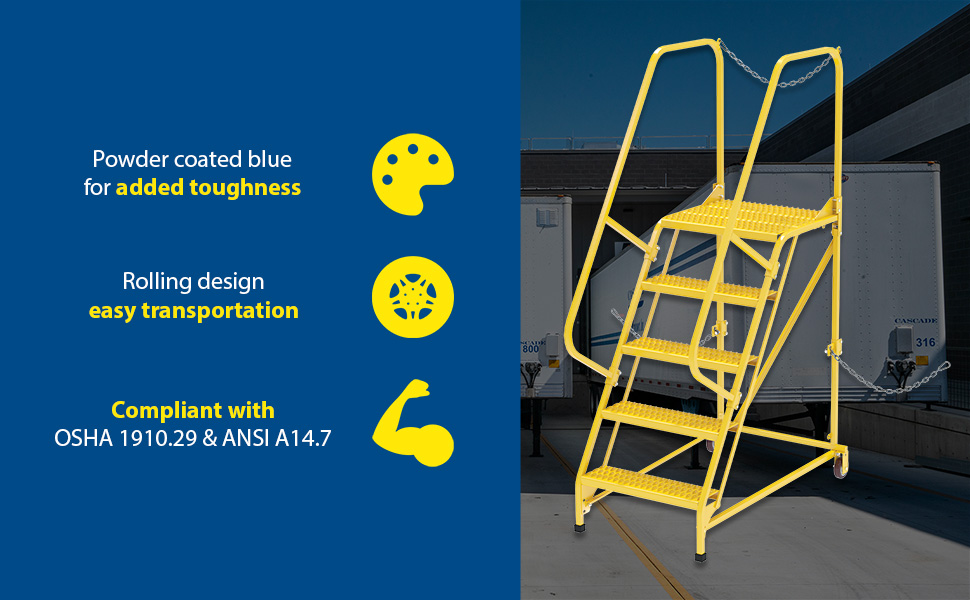 Semi-Trailer Access Ladders are for use getting into Semi-Trailers. Tilt the unit to allow for portability. Units roll on 4" poly-on-poly wheels. Constructed of square tubing framework which handles uniform capacities up to 350 lbs. Features 30" high removable hand railing, access chain, 21" deep top platform, and an industrial baked-in blue powder coat finish for toughness. Each step measures 24" wide by 7" deep and is spaced 10" apart. Climb Angle is 58 degrees.