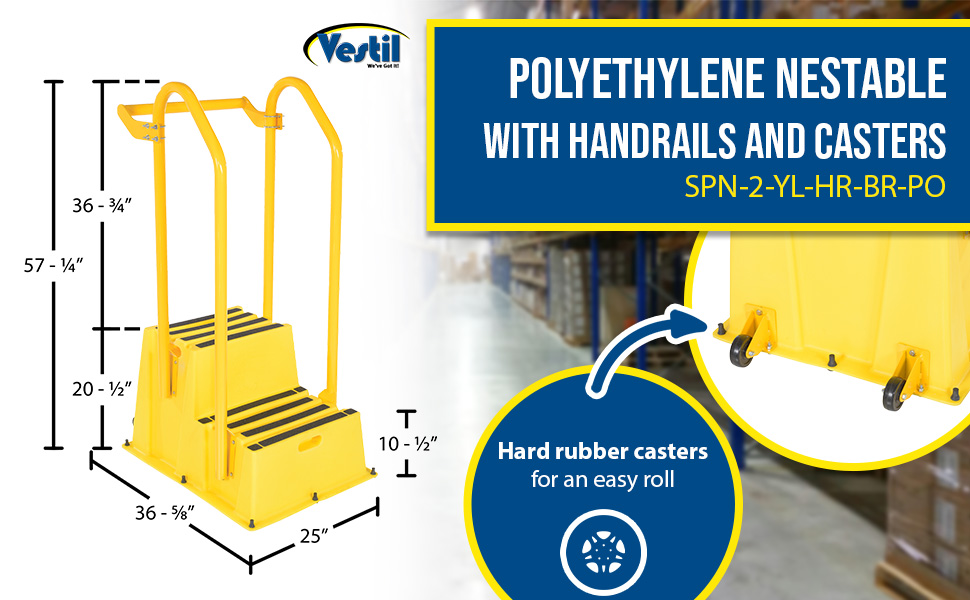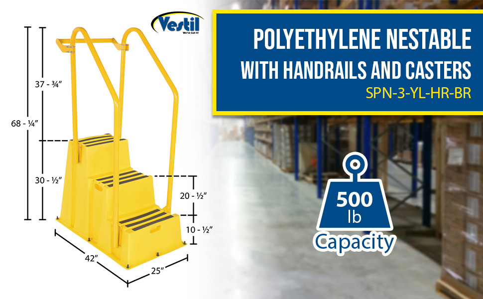 A poly step stool is a great asset for on the go or in a permanent setting. A lightweight design with front and side cutout handles, allow the user to easily transfer the stool to a preferred spot. The taped step surfaces ensure safe footing while traversing up and down the steps. Includes bolt on handrail and casters. The hand rails height allows the unit to be pushed or pulled into the desired position, minimizing bending and twisting by the user. Steps can be nested to minimize footprint when not in use.
