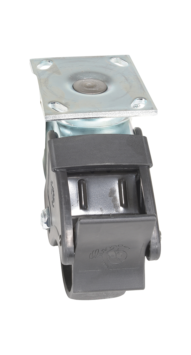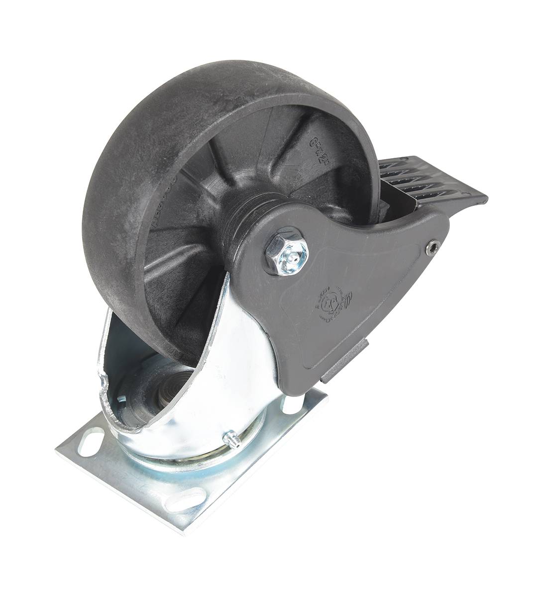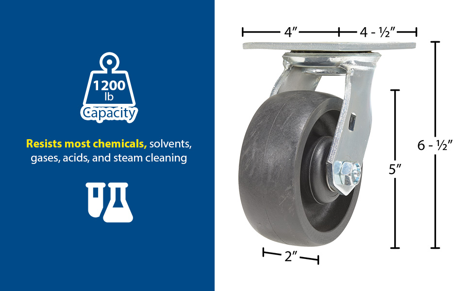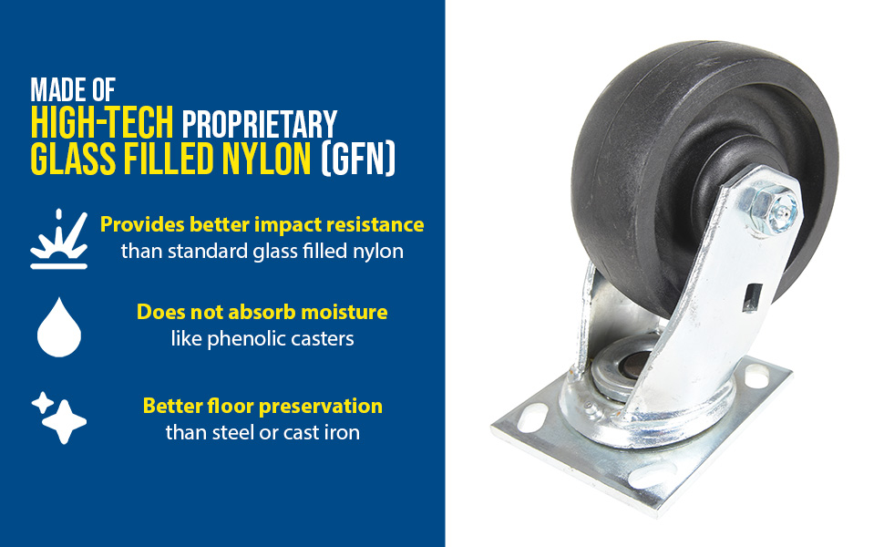 Made of high-tech proprietary glass filled nylon (RX). Provides better impact resistance than standard glass filled nylon. Does not absorb moisture like phenolic, and offers better floor preservation than steel or cast iron. Resists most chemicals, solvents, gases, acids and steam cleaning. Top plate measures 4 x 4-1/2". Black tread color. 85 (+/-5) Shore D. Wheel core material is glass filled nylon.