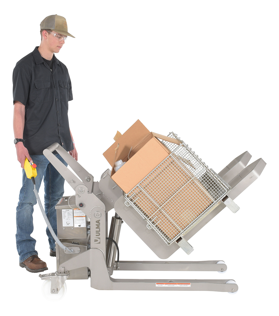 When cleanliness is a must, the tilt master is the perfect asset for the job. A stainless steel construction, with an open design, can be easily cleaned and maintained. The hand held pendant operates the tilting feature to limit the amount of physical activity involved, while also allowing the user to create distance from the tilter during use. Once tilted to the desired position, the user can maintain a more upright posture during use, while minimizing the amount of bending and twisting. Easily accessible battery box for changing and updating batteries as needed. Steering/driving handle is removable.