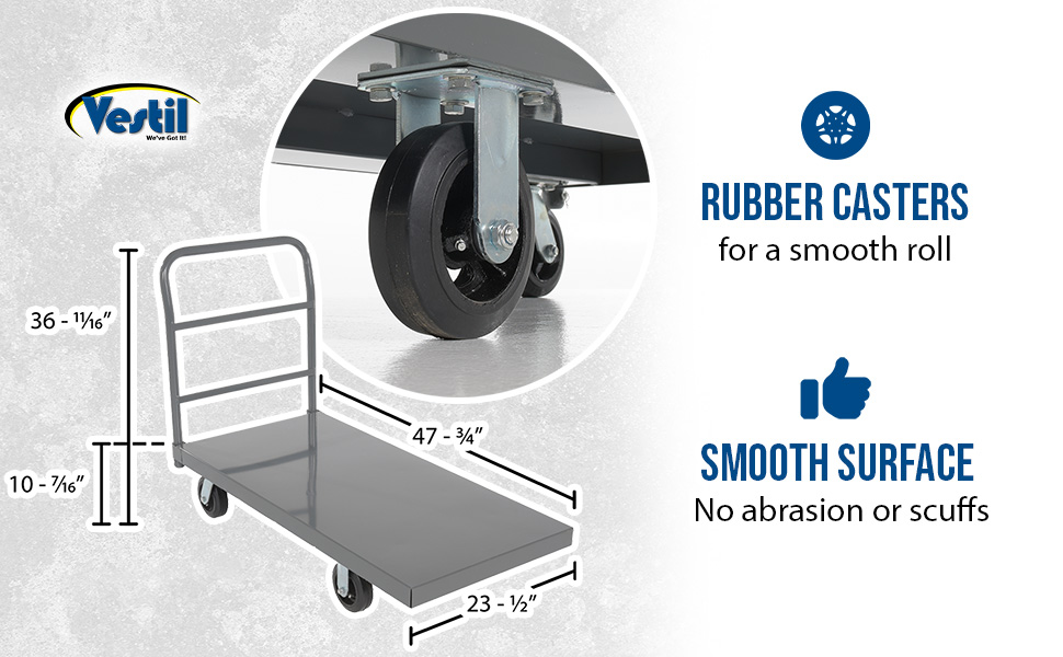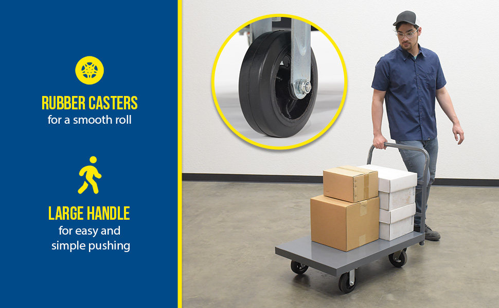 A steel tread plate on a platform truck is an upgrade to an old classic. A tread plate design enables the user with a better sense of security. With this added texture, the amount of jostling and movement by the products on the platform is limited. The steel handle allows the user to maintain an ergonomic posture while transferring goods. Mold on rubber casters roll smoothly. Powder coated finish provides added toughness.