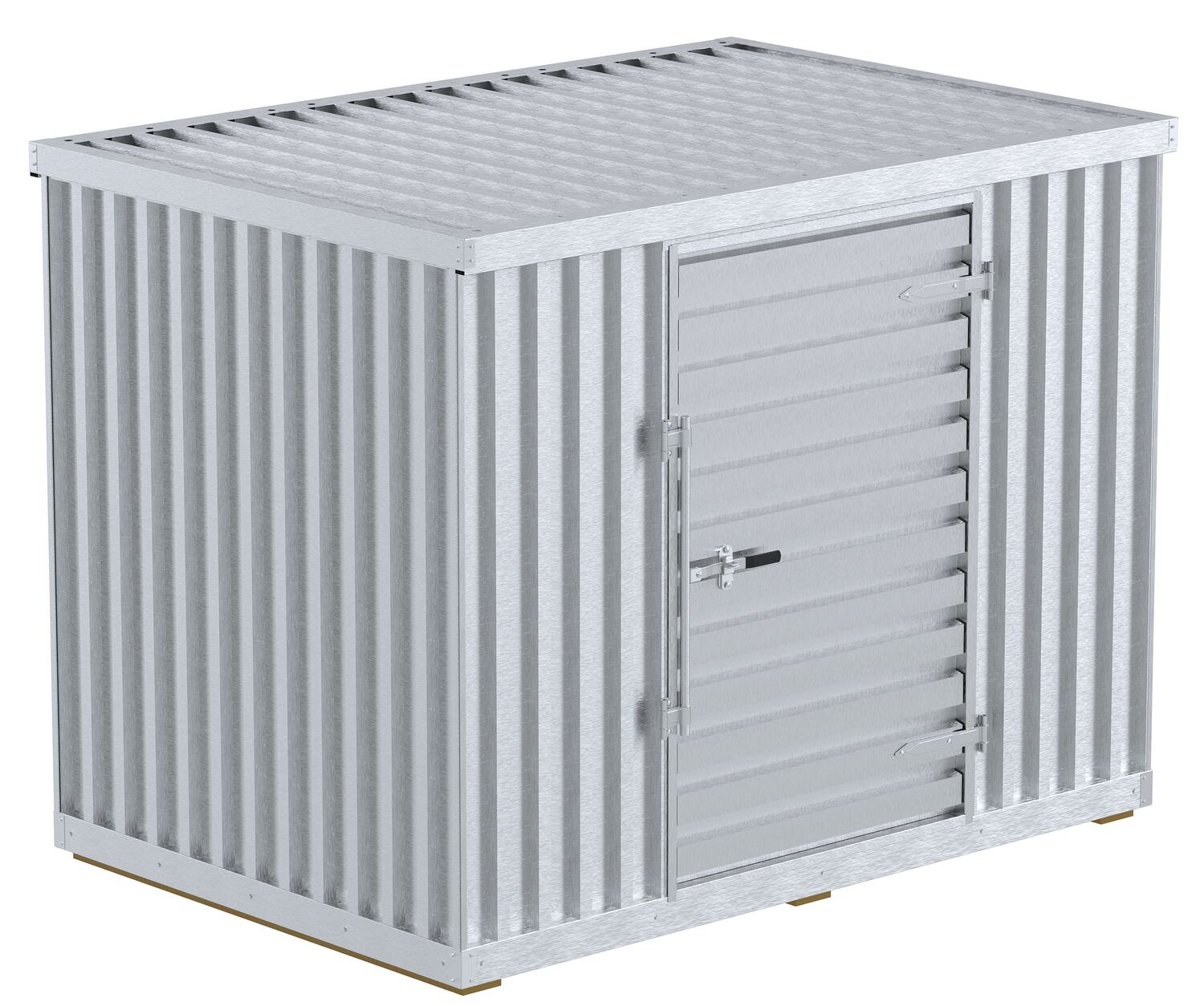 Modular storage building are ideal for keeping valuable items secure. Constructed of maintenance free galvanized corrugated paneling. The door measures 45"W x 74"H usable and features a right-side hinged lock (padlock not included). Modular design is easy to assemble. Once assembled unit can be moved with a fork lift. Each unit features a wooden floor 5-3/4" high to help keep products dry. Built-in rain gutters for water drainage is standard.