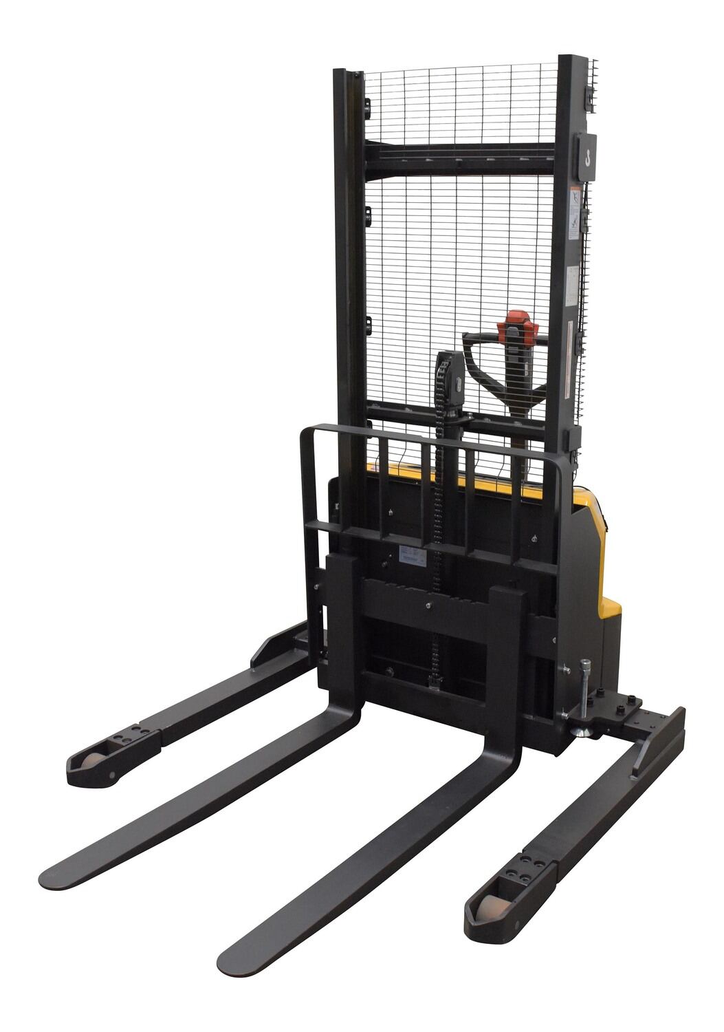 Double Mast Electric Stacker quickly and quietly moves through facilities. Many accessories are included such as speed functionality, forward/reverse knobs, and a battery charge indicator. Powered by a lithium ion battery, the stacker is able to lift the heavy loads often found in manufacturing and shipping facilities. The walk behind design allows the driver to have full control of the steering handle. Forks are adjustable for use with a variety of pallet and products. Hardware included.