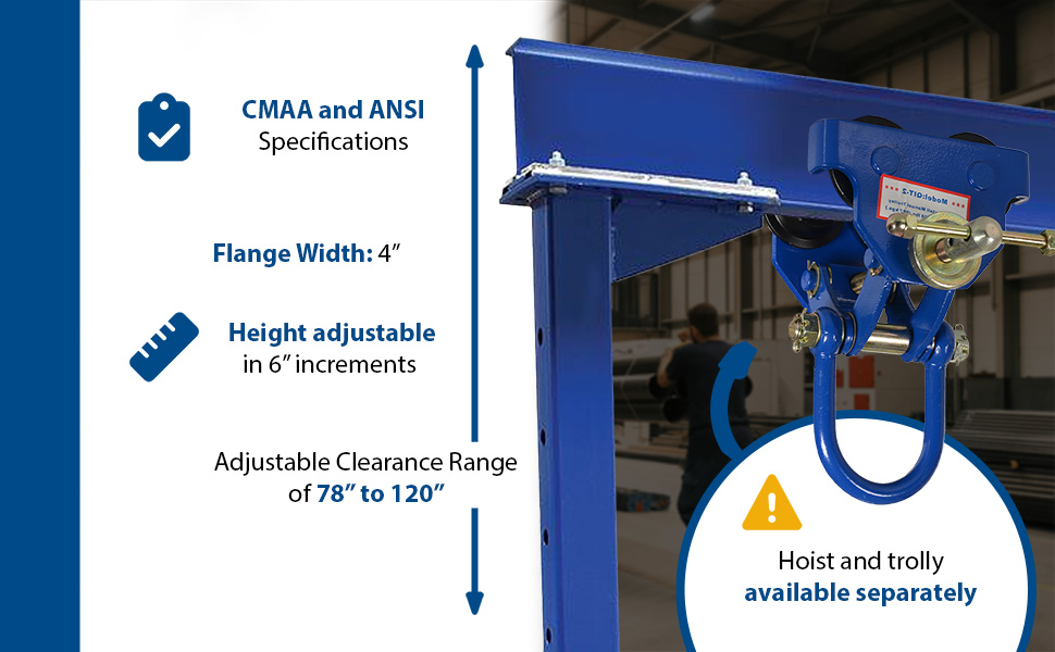 The adjustable height steel gantry crane is designed for transporting and positioning materials along the beams length. The cranes beam height can be adjusted to better conform to the working conditions making it both ergonomically friendly and cost effective. Unit comes standard four (4) V-groove casters, allowing for quick movement and positioning adjustments. Height is adjustable in 6" increments. Designed for semi-permanent or permanent applications. Do not move units while loaded unless using V-Groove Caster and Track Option. Hoists & Trollies can be ordered seperately.