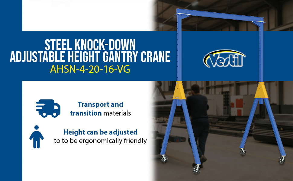 AHSN-2-20-16-VG AHSN-2-20-16-VGSteel Knock-Down Adjustable Height Gantry Crane with V-Groove Cast Iron Casters 20 Ft. Wide x 16 Ft. Max Usable Height 2,000 Lb. Capacity BlueUniform Capacity (lb.): 2,000