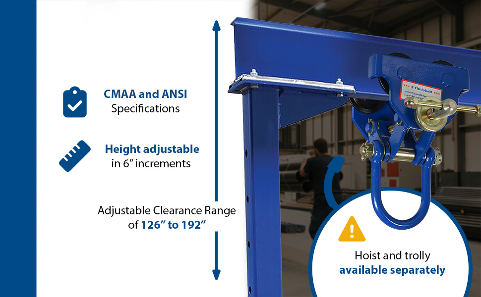 AHSN-2-10-16-VG AHSN-2-10-16-VGSteel Knock-Down Adjustable Height Gantry Crane with V-Groove Cast Iron Casters 10 Ft. Wide x 16 Ft. Max Usable Height 2,000 Lb. Capacity BlueUniform Capacity (lb.): 2,000