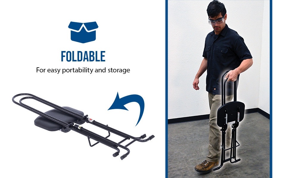 The CPRO-800LP model is not only convenient but easy to use. Simply unfold the rear legs and slide the contoured padded seat to the desired ergonomic height using the infinite adjustment for optimum work posture. Folds up to a 4" profile for easy portability and storage.