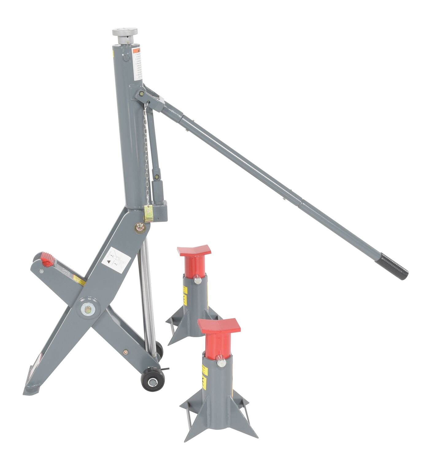Manual Hydraulic Fork Truck Jack Designed to raise your fork truck for maintenance. Features high-quality seals, chrome plated internal components and rugged steel construction. Maximum lift of 16" provides room needed to perform a variety of repairs. Manually raised by hand pump lever. Removable handle and compact size makes it easy to maneuver and transport. Includes two jack stands (13 ton capacity per pair), with holding pins for adjustable heights.