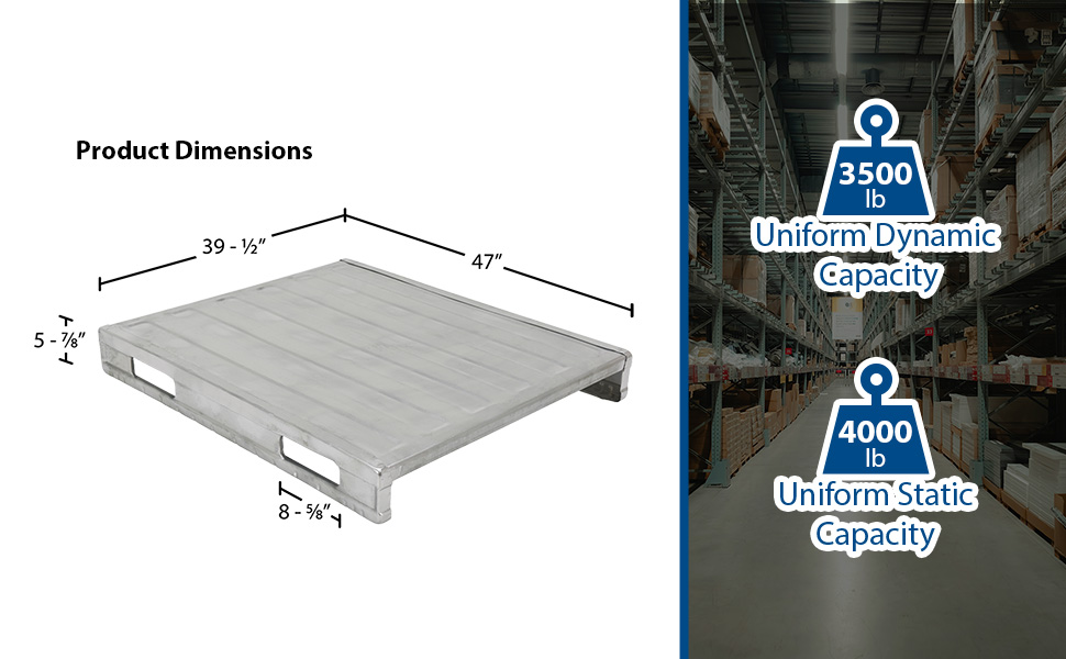 SDSP-4048 SDSP-4048Galvanized Steel Solid Deck Pallet 39-1/2 In. x 47 In. x 5-7/8 In. 4,000 Lb. Floor Capacity GrayUniform Floor (static) Capacity (lb.): 4,000