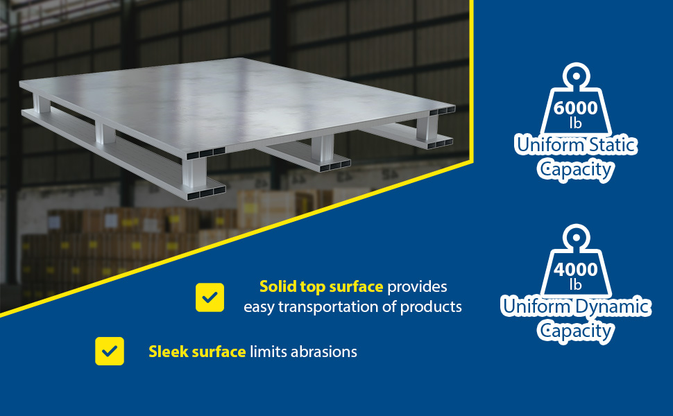 AP-ST-4824 AP-ST-4824Aluminum Heavy Duty Solid Top Half Pallet 24 In. x 48-1/8 In. x 6 In. 4000 Lb. Capacity SilverUniform Capacity (lb.): 4,000