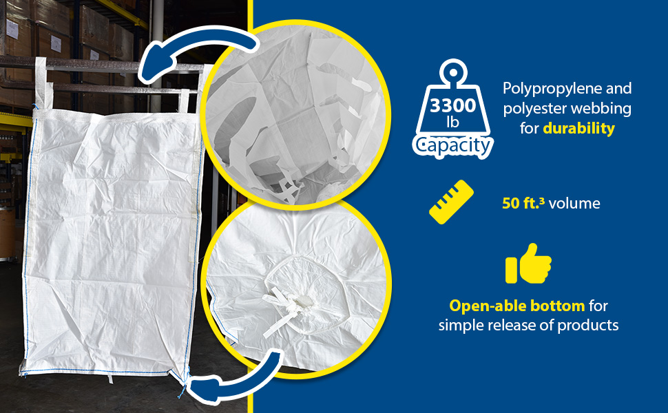 These fabric hoppers provide an economical and convenient means for storing and moving dry bulk commodities. The coated polypropylene has a polyester webbing for extra strength. The 8 oz. white fabric is UV treated. Fold for easy storage when not in use. The 4 corner straps provide convenient forklift handling, while the bottom of the unit can be opened for simple release of products. Capacity 3300 lbs.