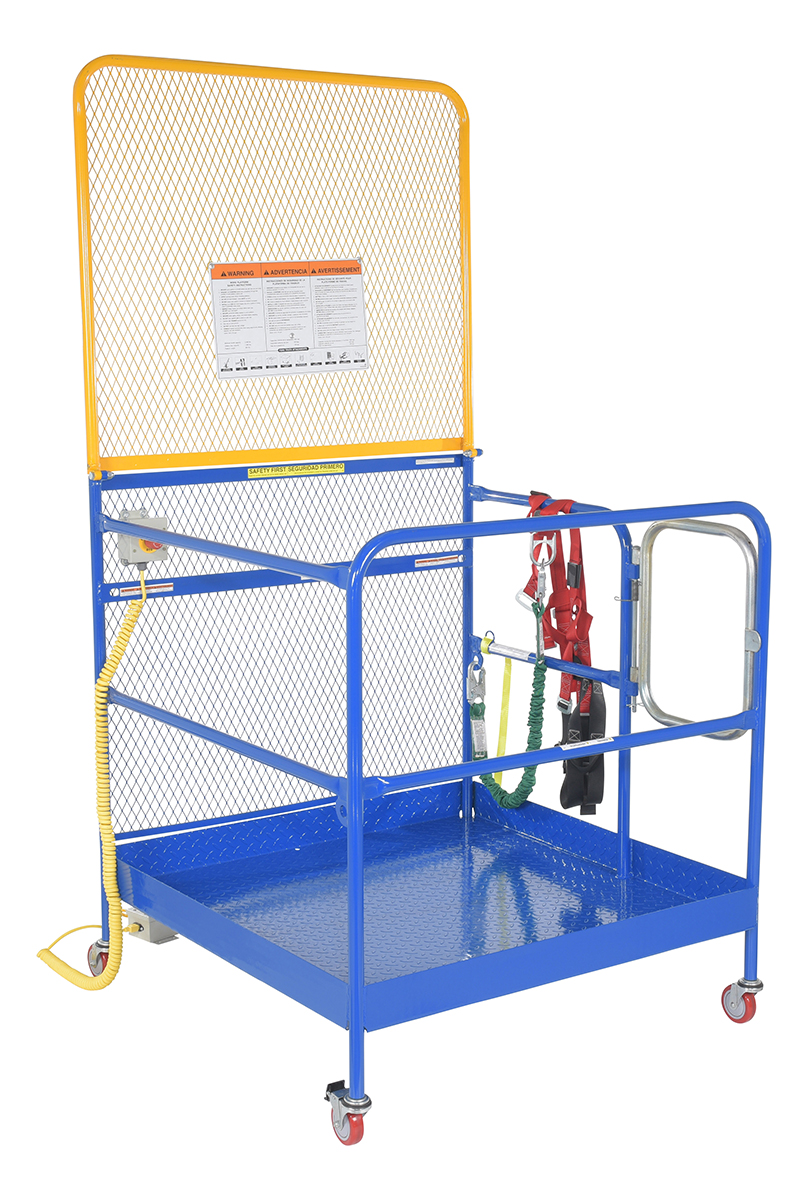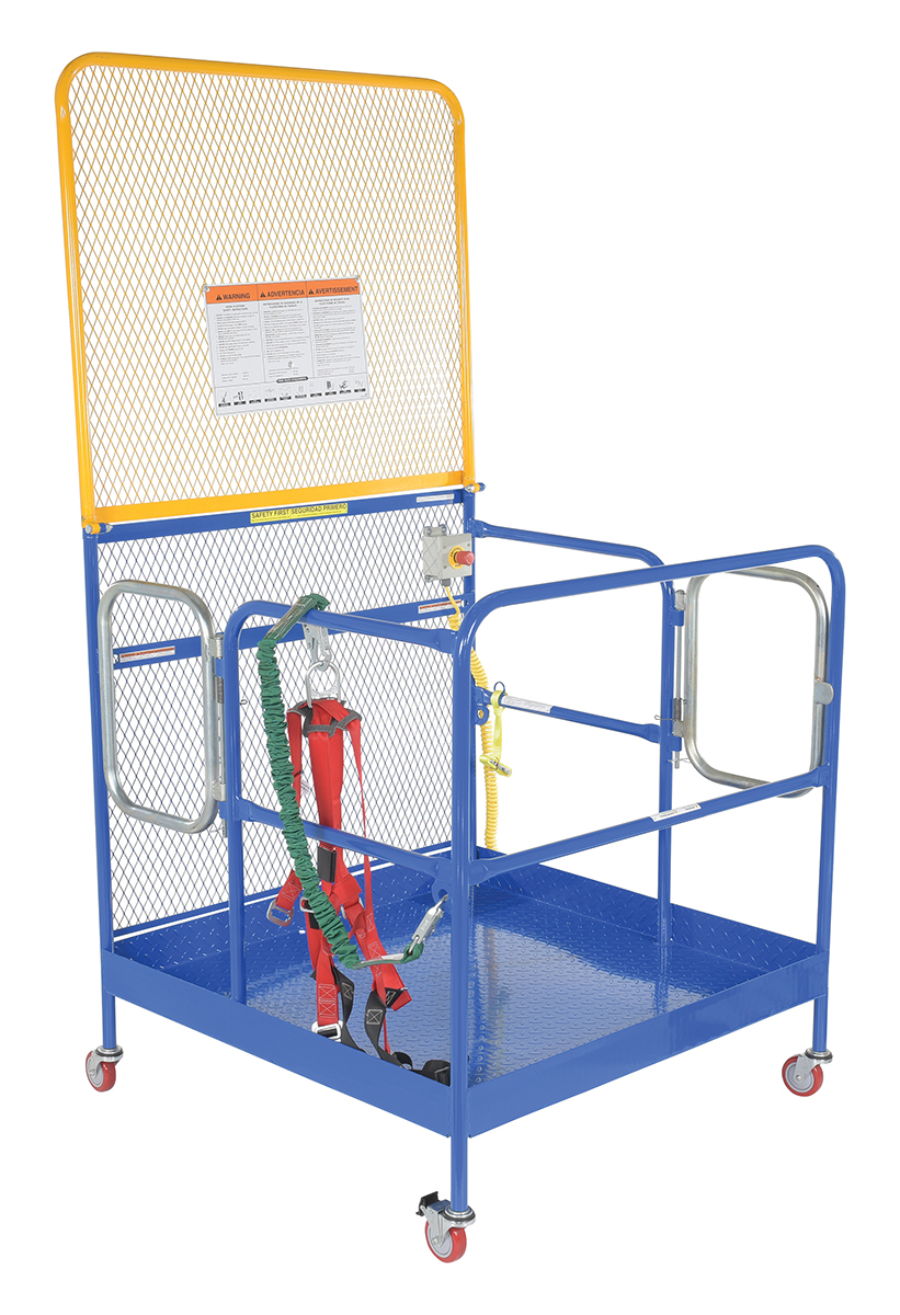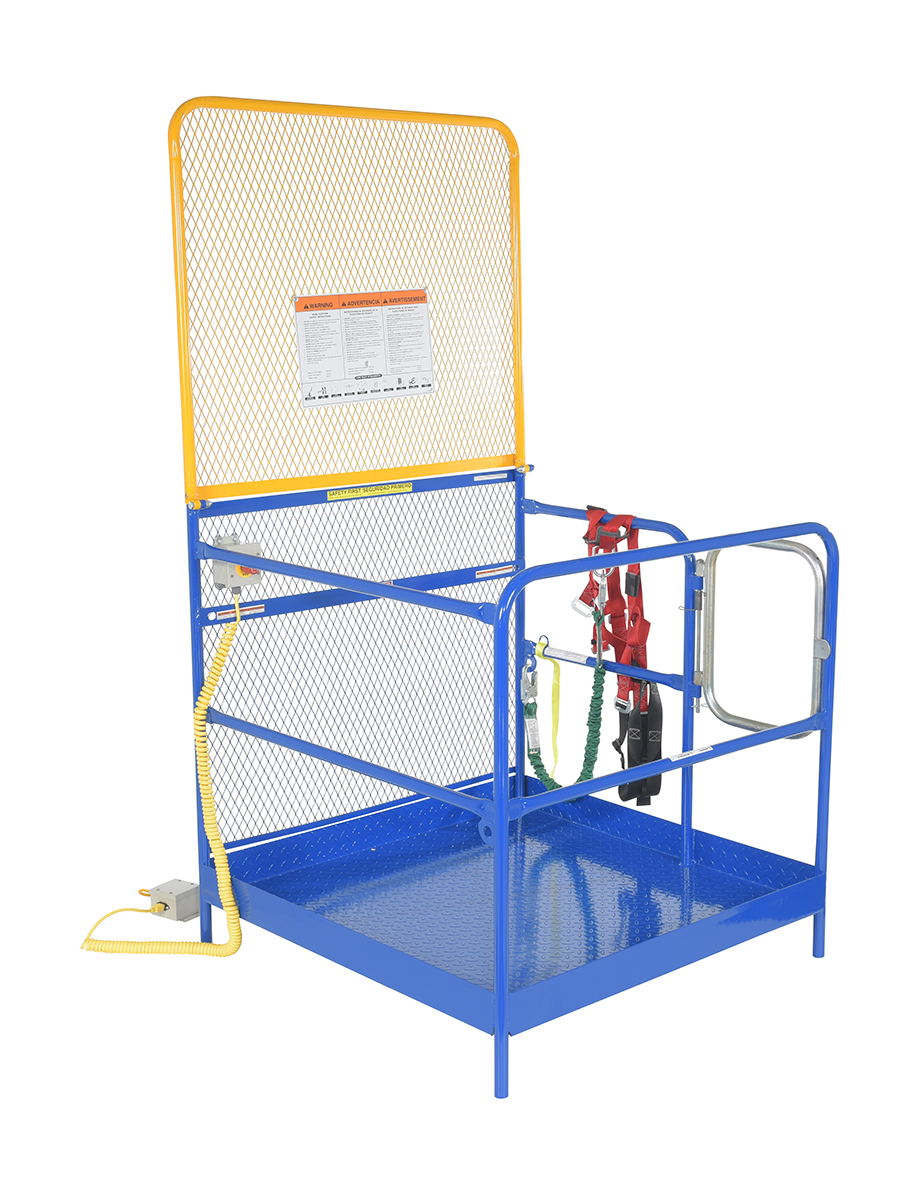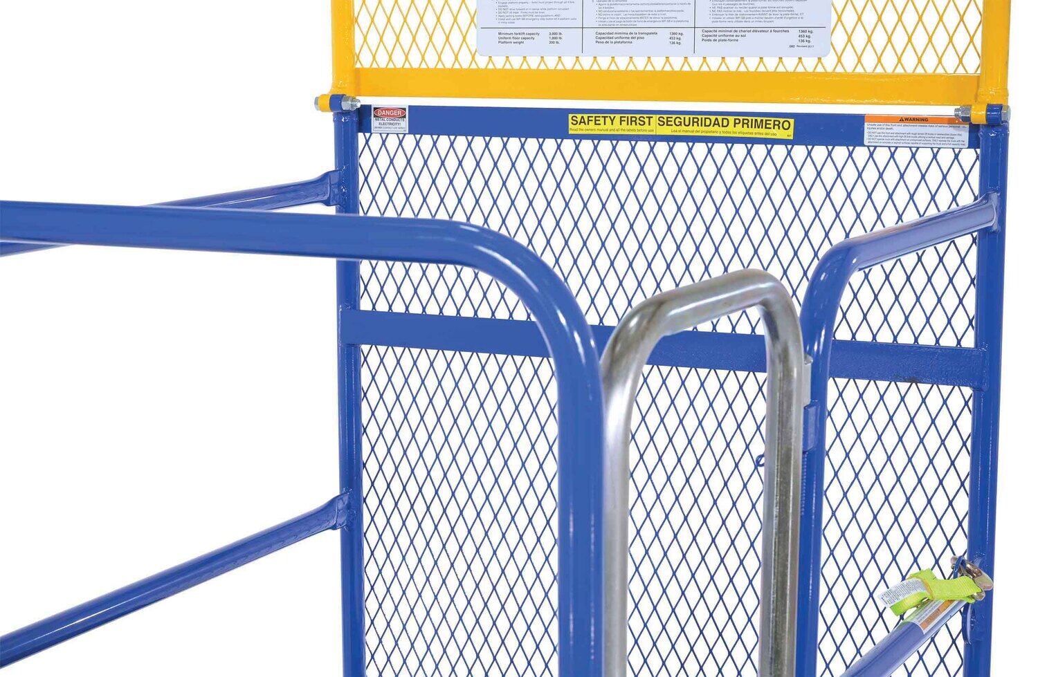 Each platform is built with key safety features including tine locks and a safety strap that secures the unit to the forktruck carriage. Select models include a spring-loaded self-closing door, while a yellow breakaway top section helps reduce risk from overhead contact.  Models with an -84B suffix meet California OSHA requirements with an 84” rear guard. Platforms are designed for use with a safety harness with lanyard (available under options) and include anchor points to hook them too.  Anchor point capacities: