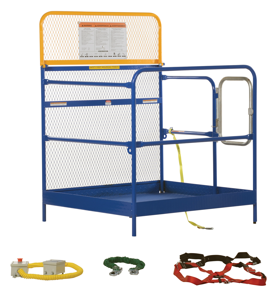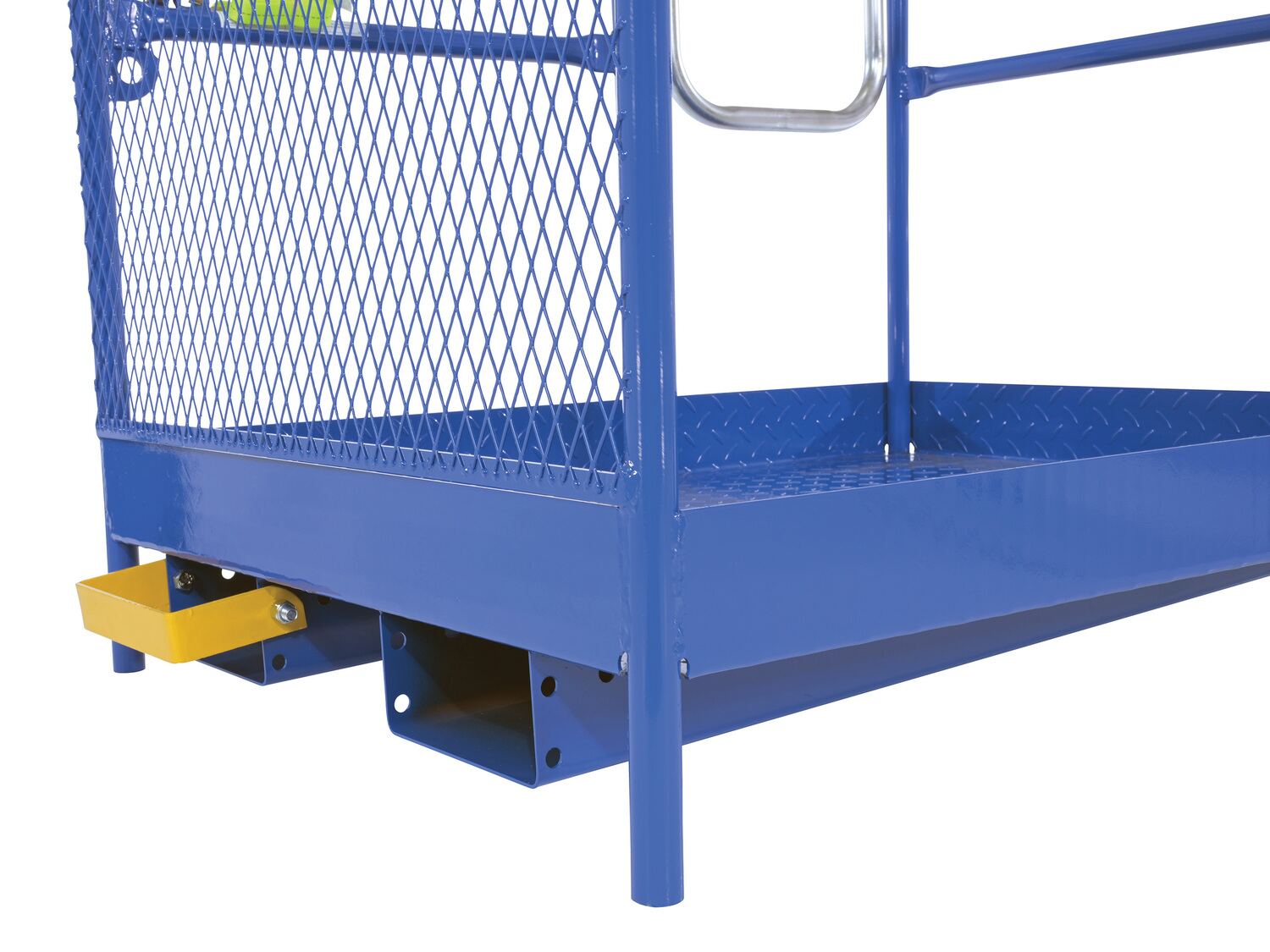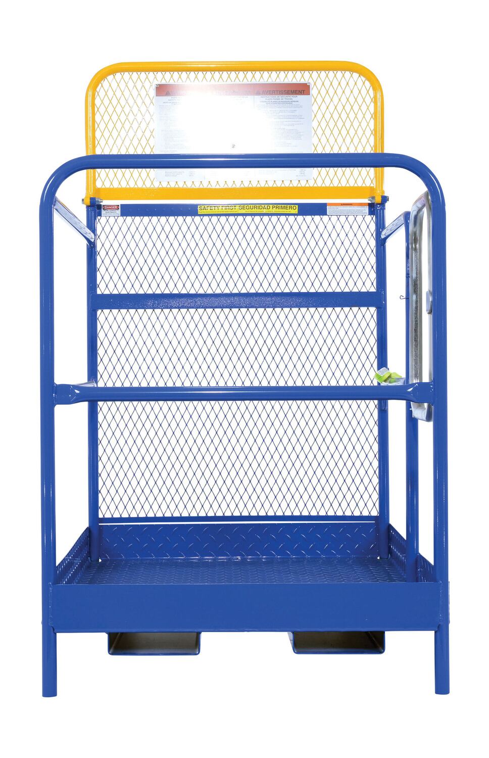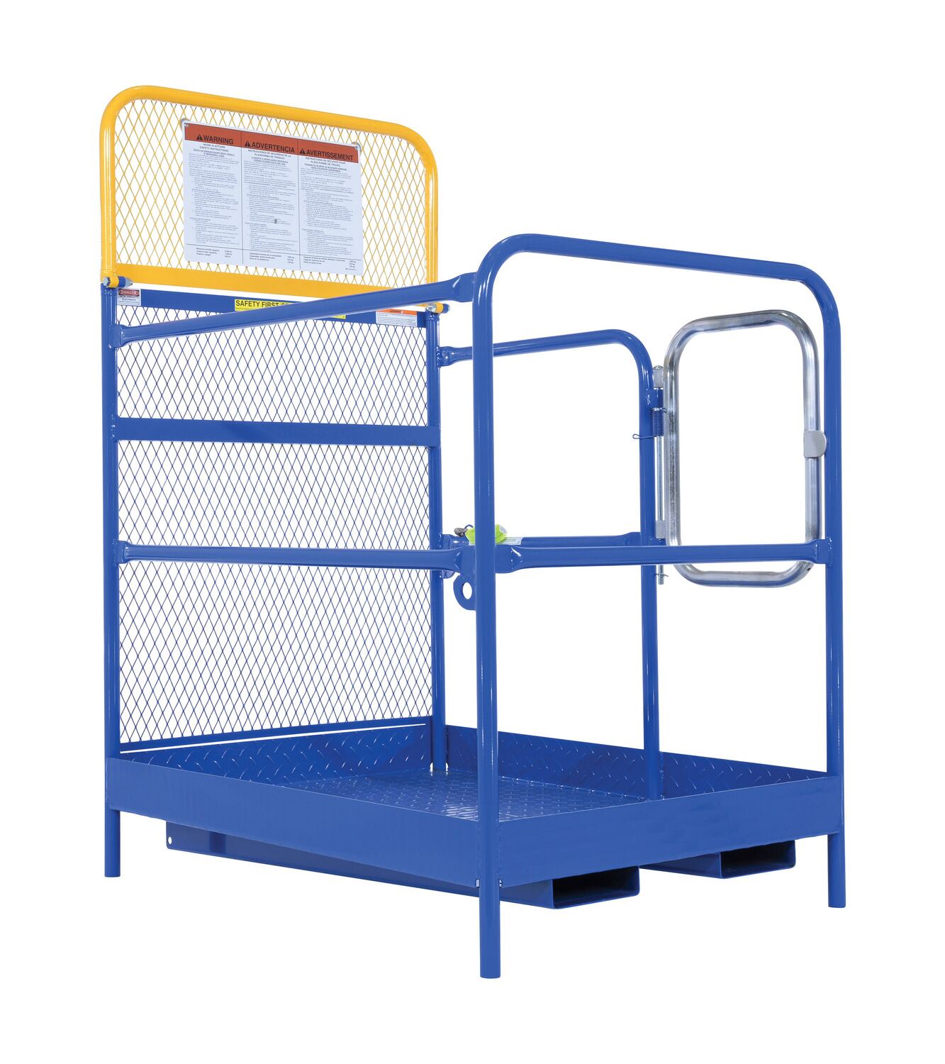 Each platform is built with key safety features including tine locks and a safety strap that secures the unit to the forktruck carriage. Select models include a spring-loaded self-closing door, while a yellow breakaway top section helps reduce risk from overhead contact.  Models with an -84B suffix meet California OSHA requirements with an 84” rear guard. Platforms are designed for use with a safety harness with lanyard (available under options) and include anchor points to hook them too.  Anchor point capacities: