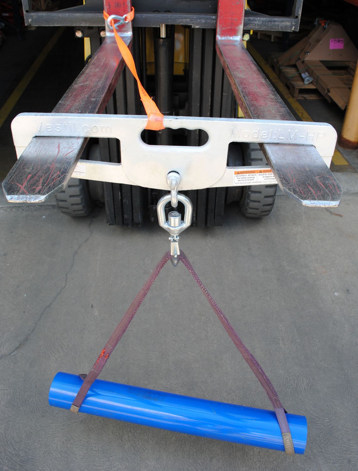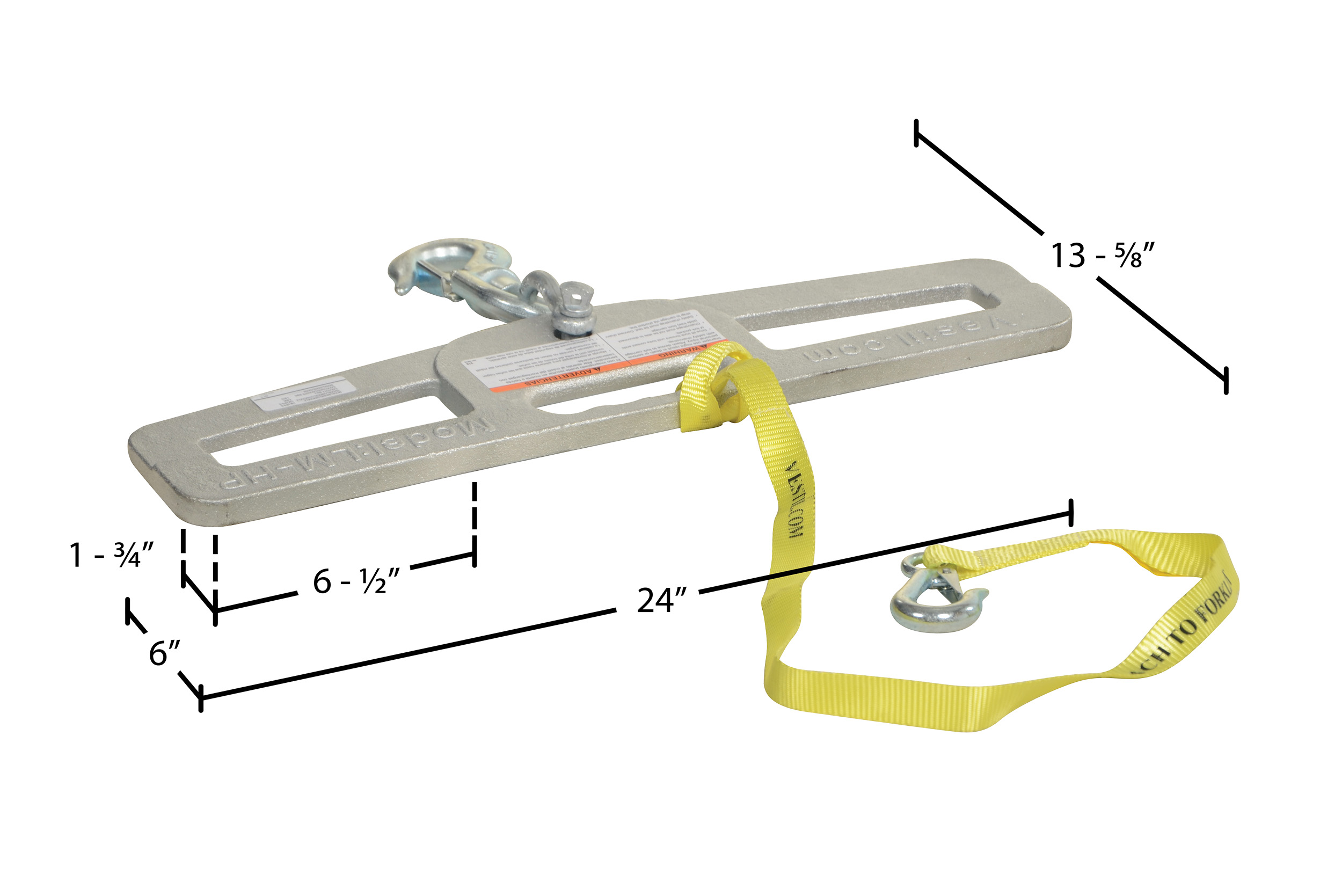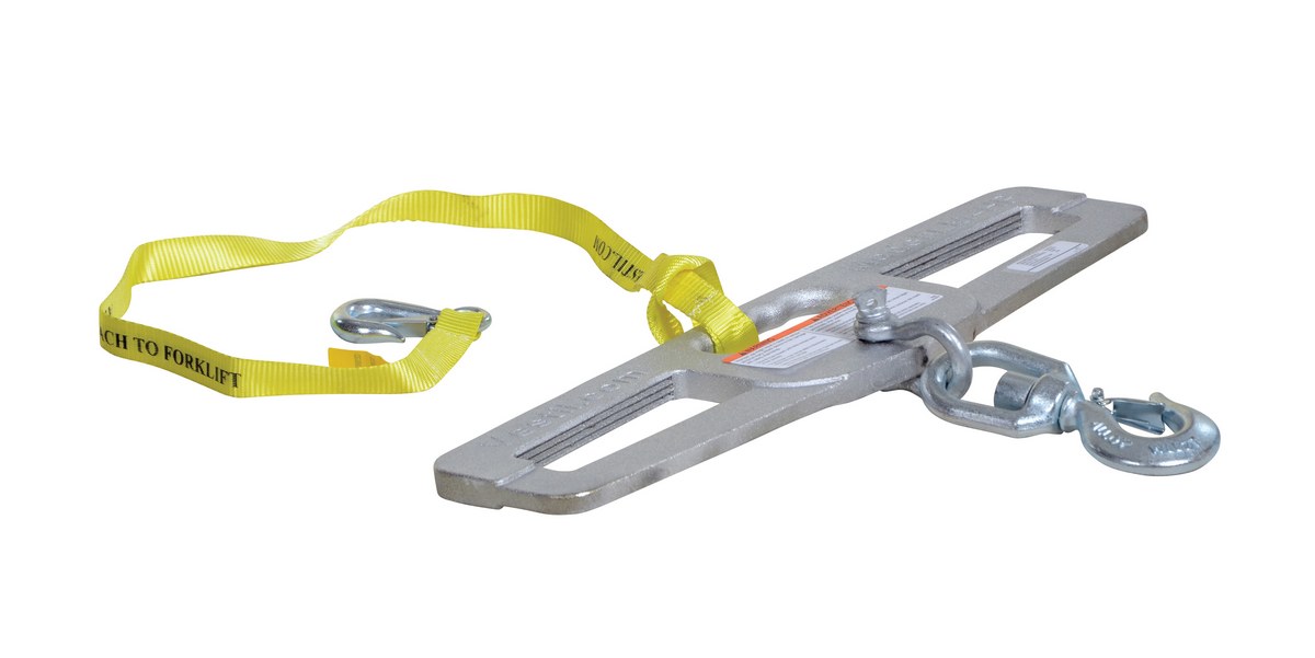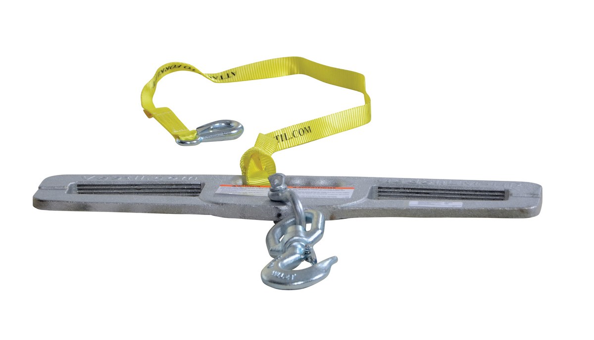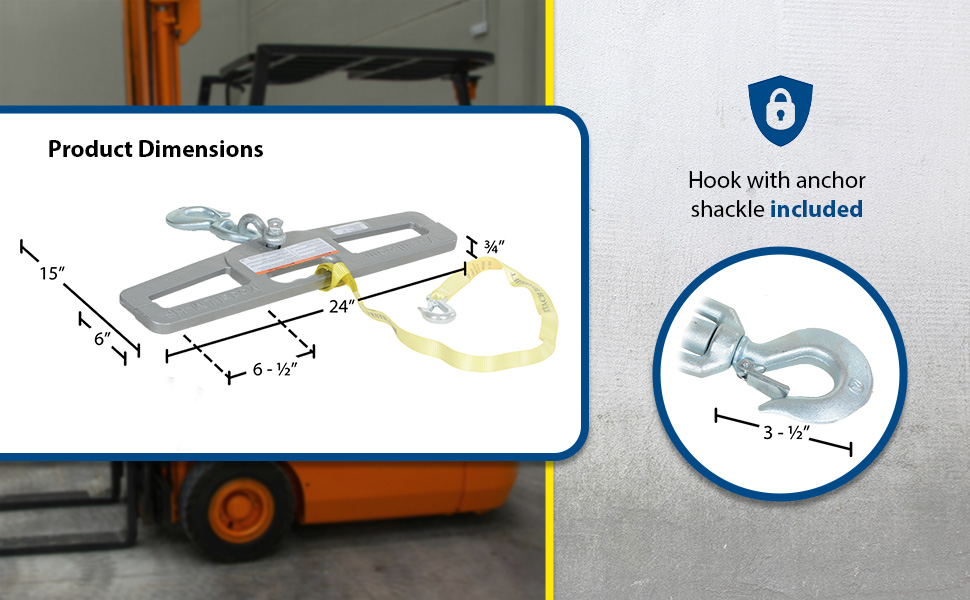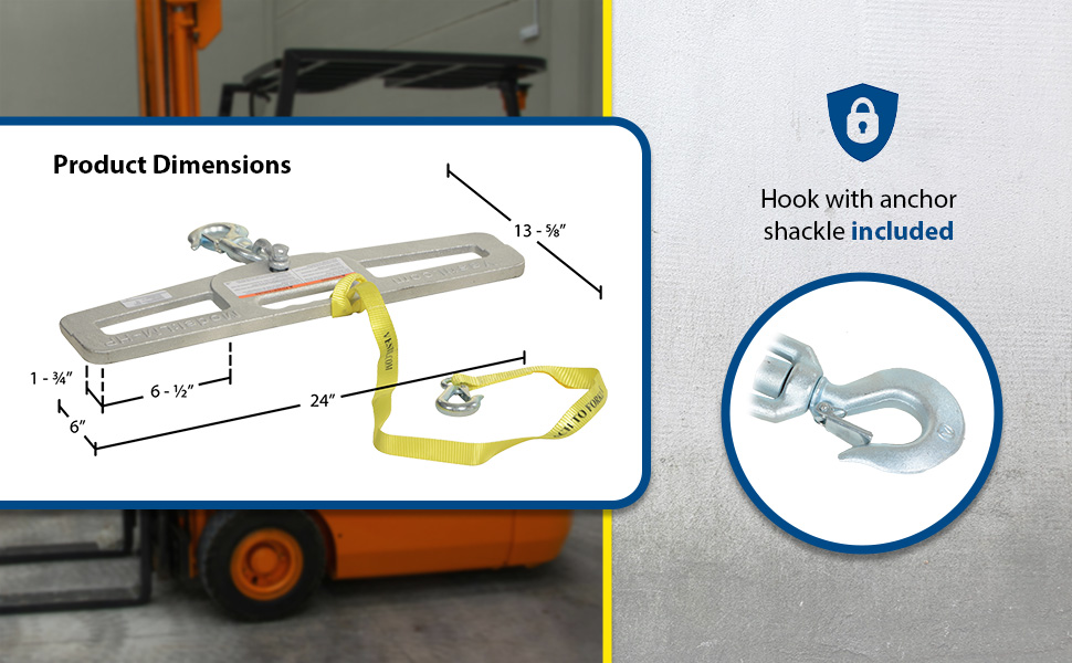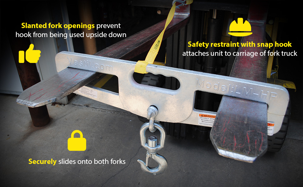 Hook Plates enable any fork truck to safely lift a load using chains, cables, or slings. Features slanted fork openings measuring 6-1/2" wide by 1-3/4" high to prevent the hook plate from being used upside down. A hook with anchor shackle is included. A safety restraint secures the unit to the fork truck. Model LM-HP10-SL has fork openings measuring 7"x2" and includes a swivel lifting hook with a latch.