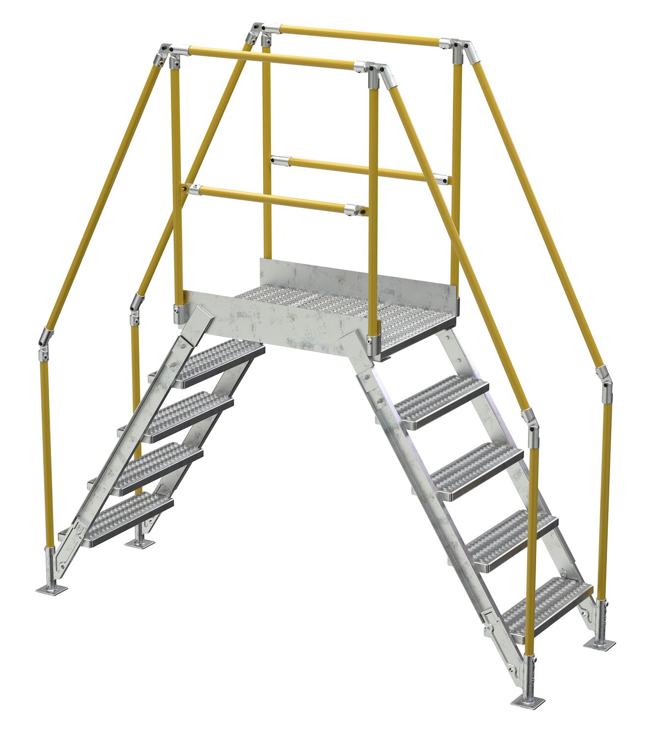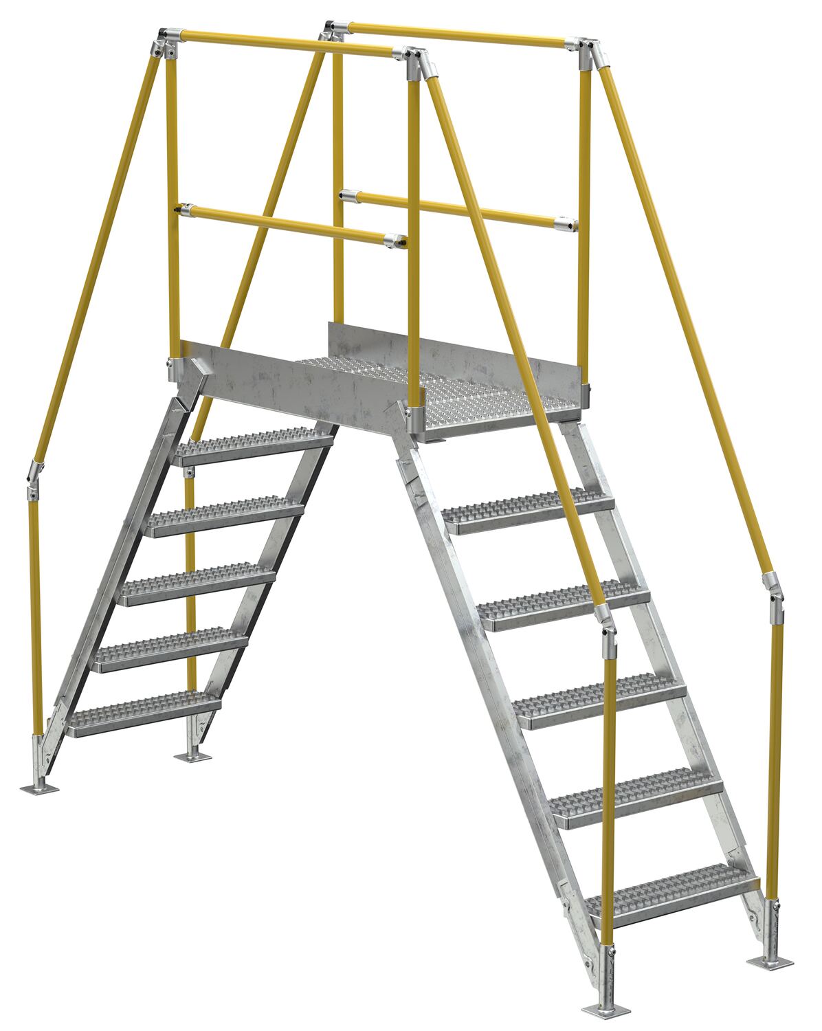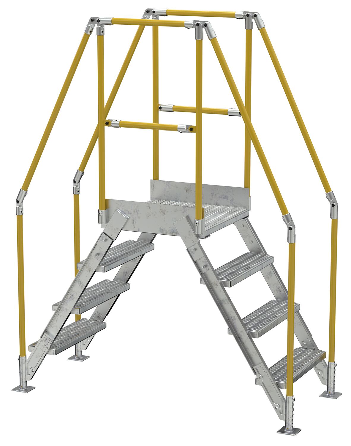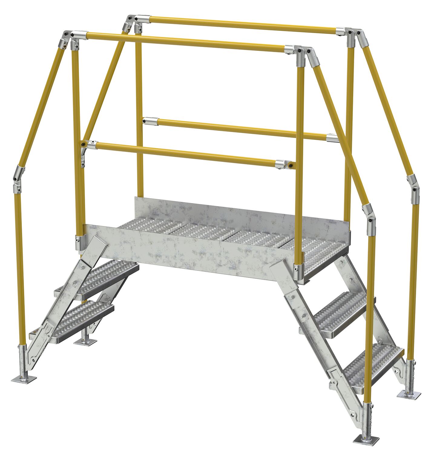 In crowded industrial settings, sometimes the best way around an obstruction is up and over. Utilizing a crossover ladder allows the permanent pieces in the work area to stay in place, while providing a more efficient option for personnel. The horizontal platform includes both upper and lower rails for complete staff security. Ground legs include floor mounting pads and units must be anchored to the surface. During times of temporary use, the ladder can be uninstalled and 'knocked-down' for storage and shipping. Handrails have a safety yellow powder coat finish. Steps and platform have a durable hot dip galvanize finish.