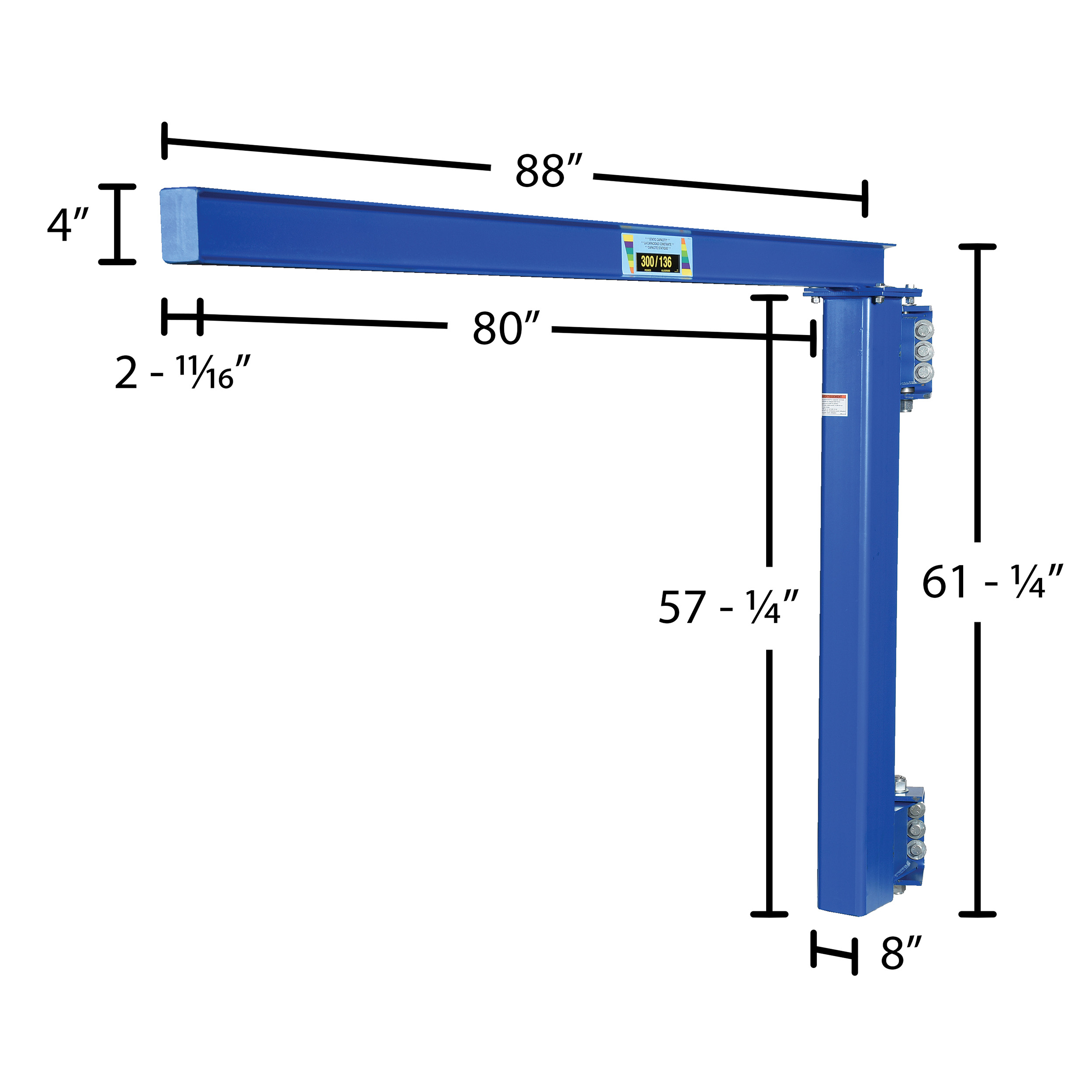 Designed to assist workers in the maneuvering of materials as well as achieving maximum headroom where low ceilings are of concern. This cantilever style mounts to true vertical wall members. Increase personnel productivity by lifting awkward materials. The overall I-beam length is 88" with a usable length of 80". Overall length of jib is 96-1/8". Unit rotates 180 degrees. Steel construction with painted blue finish. Hoists & Trollies can be ordered seperately.