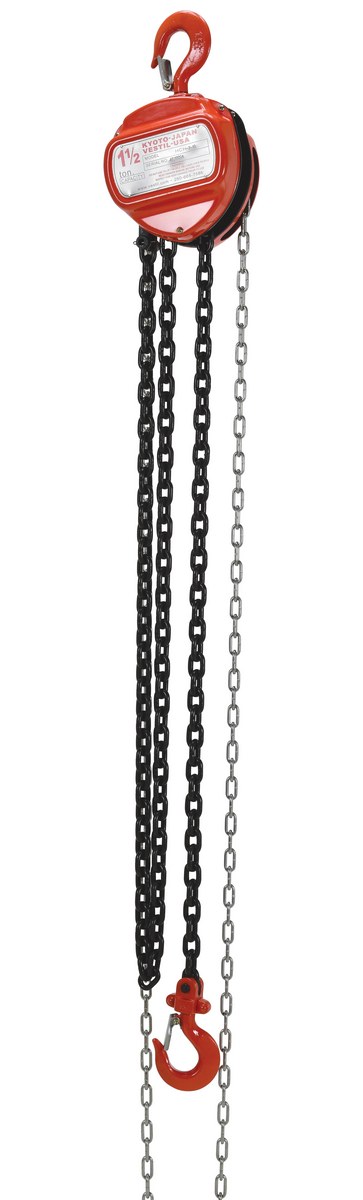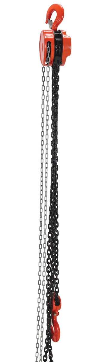These portable, lightweight hoists are durable and easy to operate. Compact design and low headroom allow installation in confined areas. Enclosed double ratchet pawls with self adjusting disc brake standard. Designed with a safety factory 4 times rated capacity. Individually tested at 150% rated capacity. Features grade 80 black chain tempered to ISO 3077, pull chain, hardened two-stage gears and forged steel upper and lower hooks with safety latches. Constructed of high quality steel components ideal for industrial applications. Meets ANSI B30.16-2003 requirements.