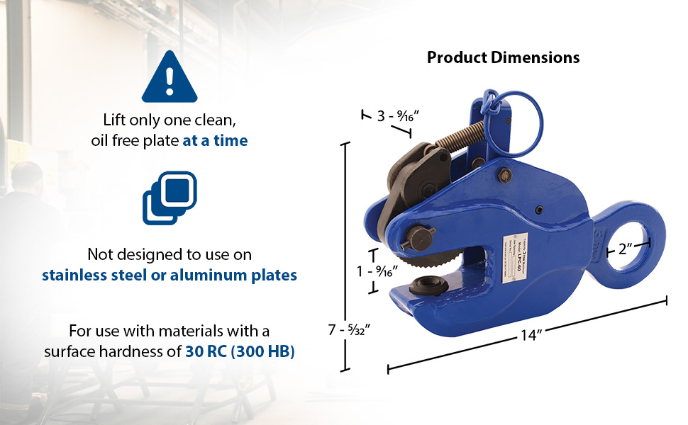 Grips sheet until release ring is pulled. Serrated gripper is hardened tool steel. Forged head and gear. Safety factor is 2 to 1. Power coated finish. Designed to meet ASME B30.20 standards. Do not use plate clamps to lift loads less than 20% of rated capacity. Lift only one plate at a time. Plate must be clean and free of oil. Not designed to use on stainless steel or aluminum plates. For use with materials with a surface hardness to 30 RC (300 HB).