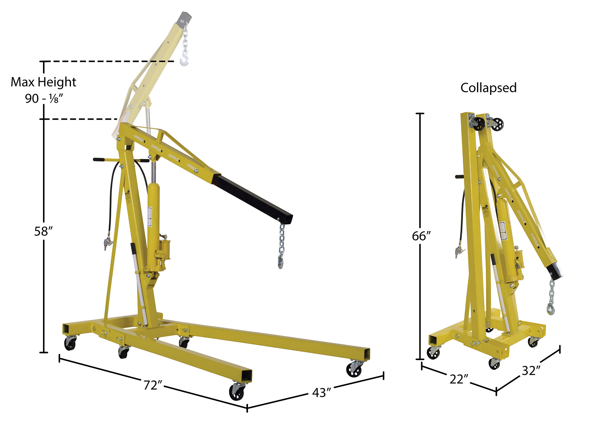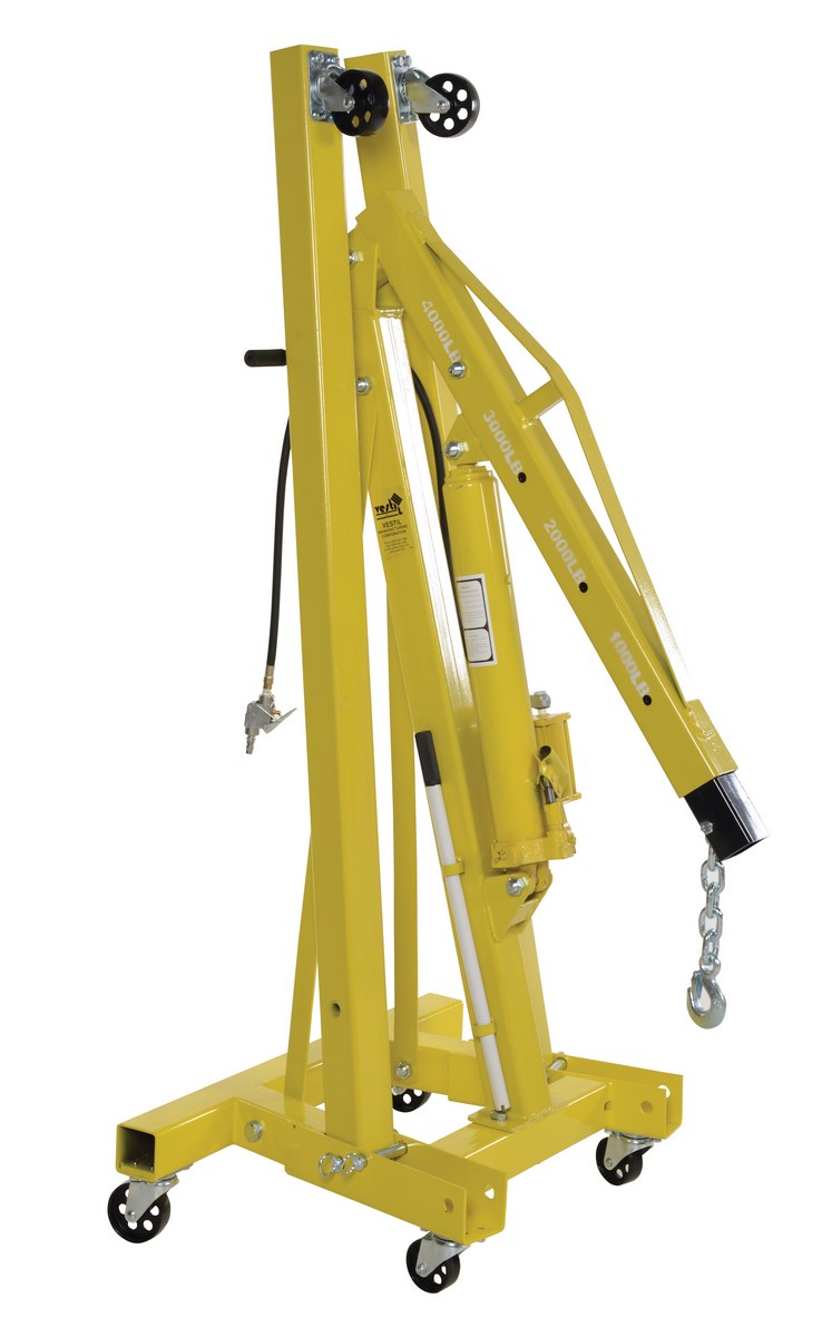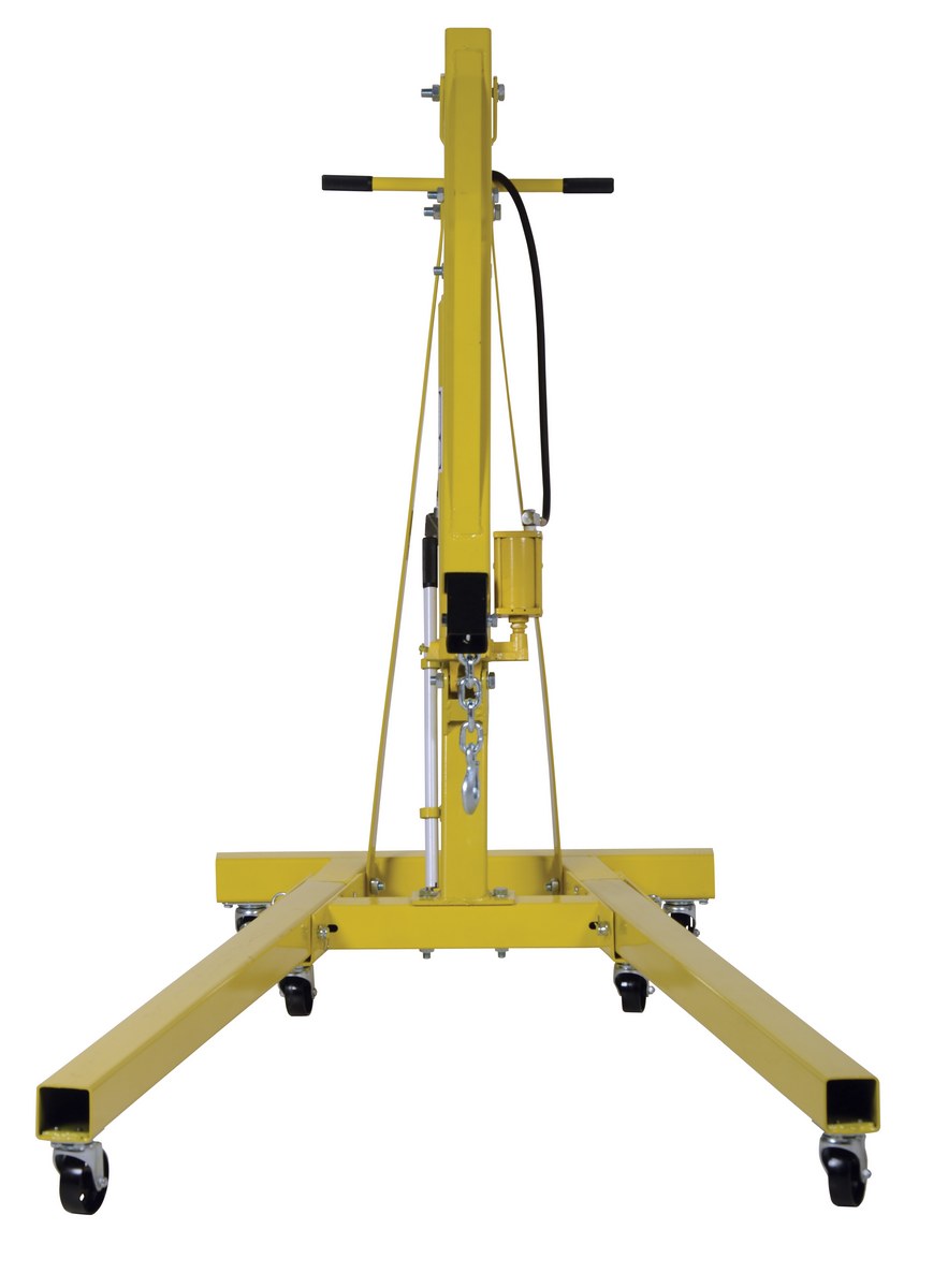 This crane allows one person to maneuver product from location to location, and then lift it with everyday factory air. If air is temporarily unavailable, lift product with the hand pump hydraulic option. Air raises unit 7" to 8" per second. Hand pump raises units 1/2" per stroke. Units roll on 3-1/2." x 1-1/4." cast steel casters, (4) swivel in back (2) rigid in front. The Hoist offers heavy-duty lifting power, while optimizing space when in the folded position. Standard features: foldable legs, adjustable boom, swivel hook, and steel construction.
