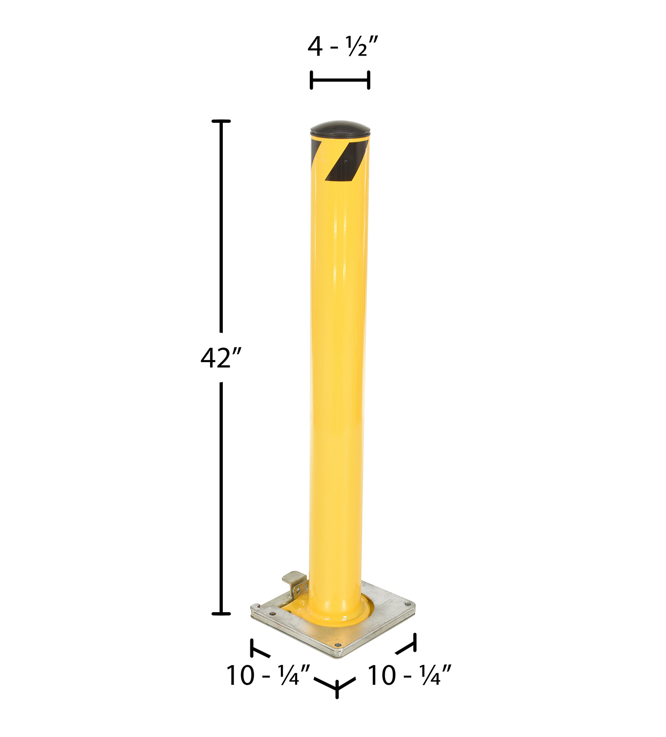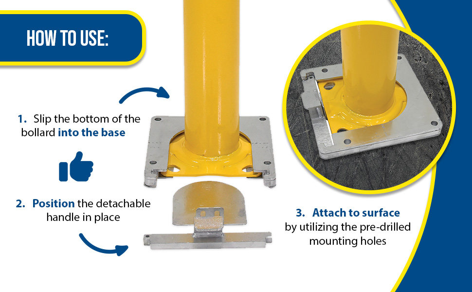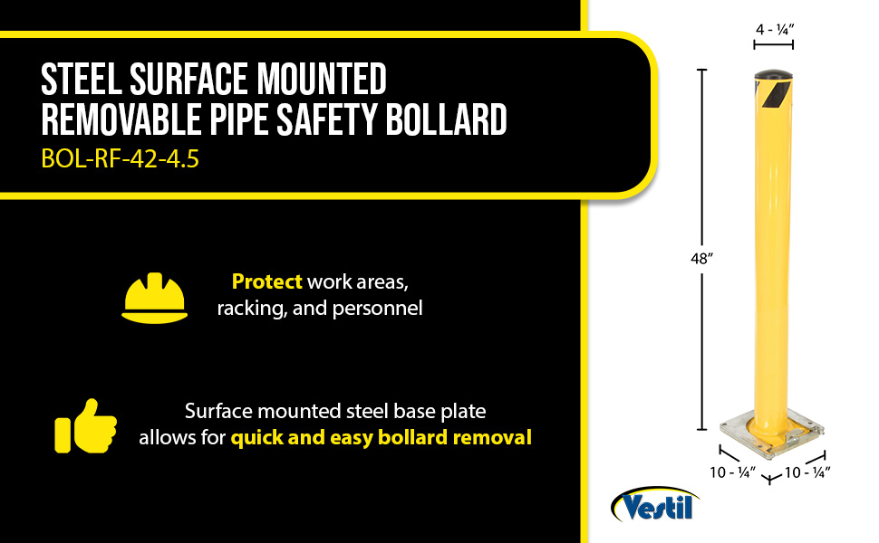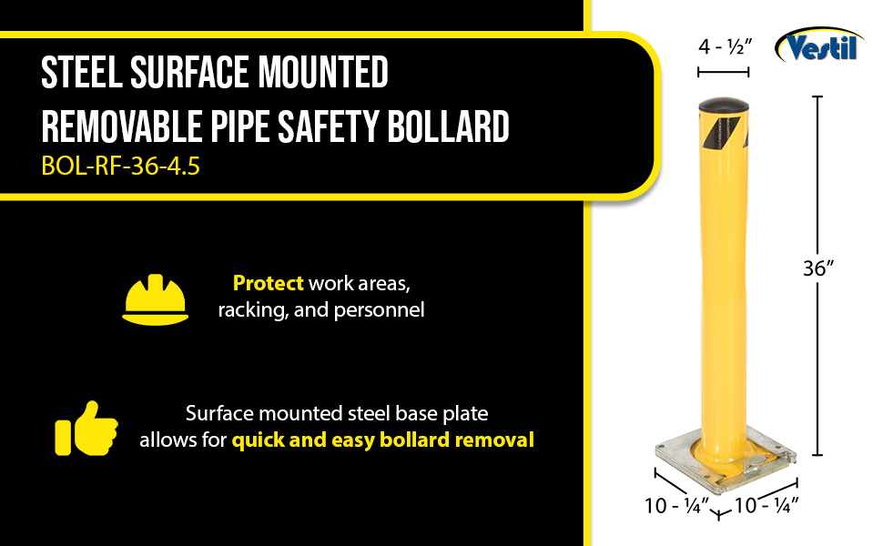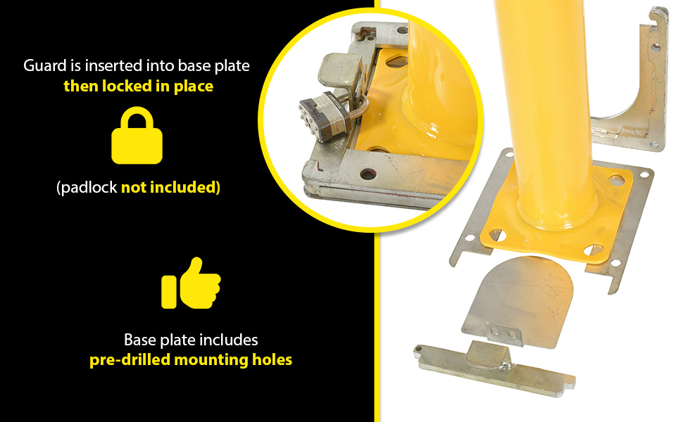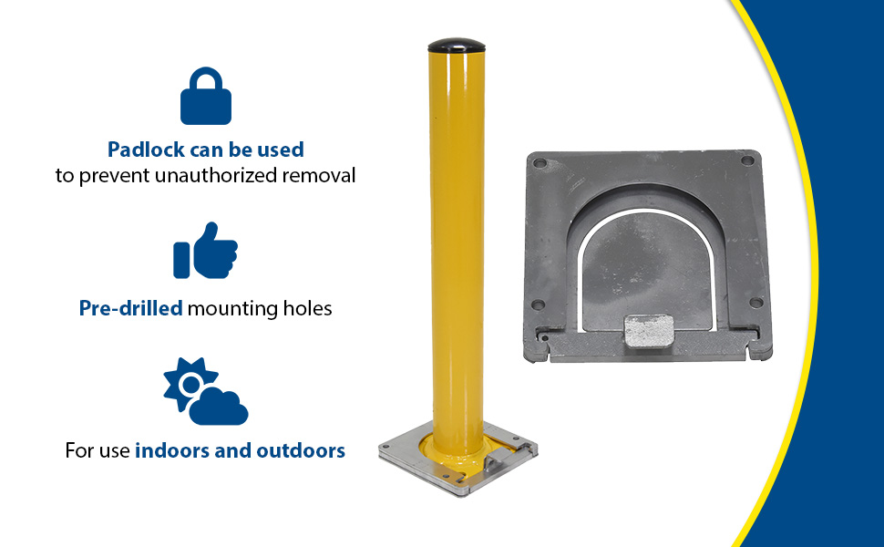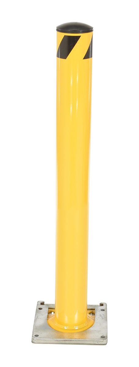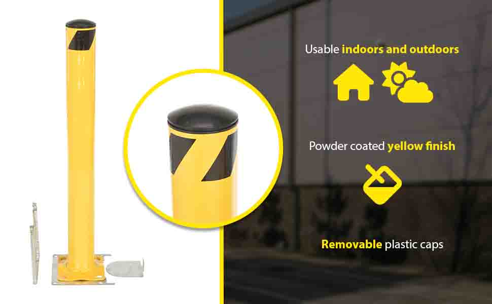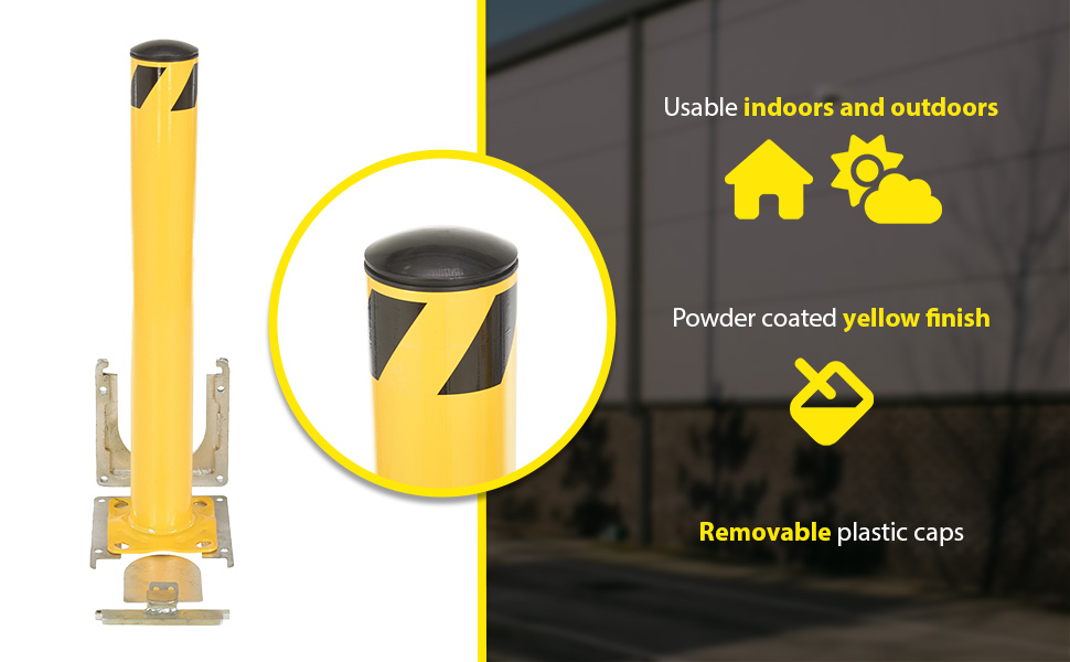 Bollards can be used both indoors and outdoors to protect work areas, racking and personnel. Surface mounted zinc coated steel base plate allows for quick and easy bollard removal. Steel base plate is bolted in place. Guard is easily inserted into base plate then secured in place. A padlock may be added to prevent unauthorized removal (padlock not included) Base plate measures 10-1/4"W x 10-1/2"L x 2"H height and include four (4) pre-drilled mounting holes. Plastic top caps are removable. Baked-in yellow powder coat finish for added toughness. Welded steel construction.