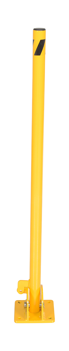 Folding steel barrier post for parking control and security. Bollard is locked in the raised position with a padlock (padlock not included). When padlock is removed, bollard may be lowered to ground to allow for access. Base plate must be lagged to ground for proper installation (installation hardware not included). Steel construction. Powder coat yellow or galvanized finish.