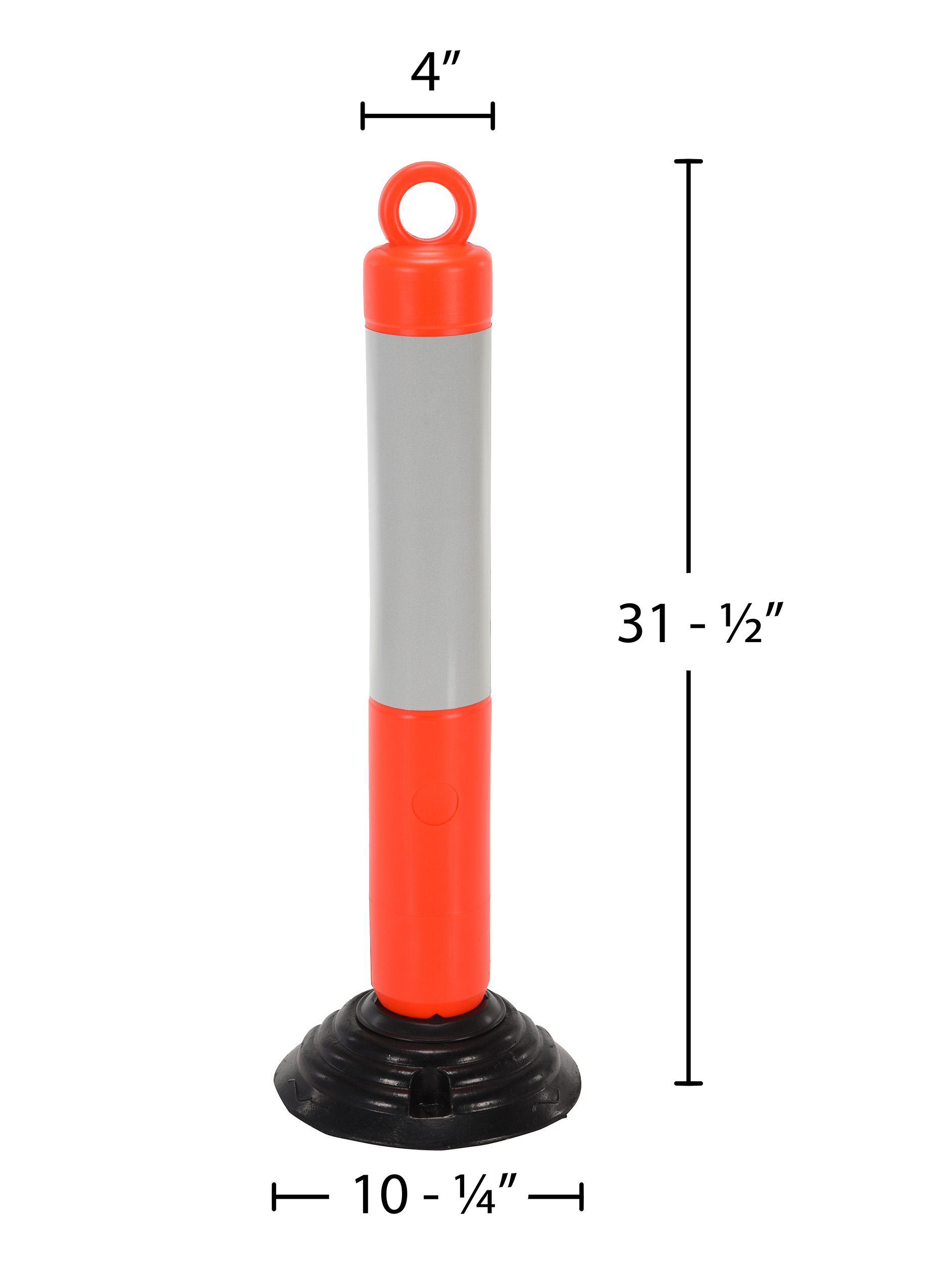 Orange Plastic Bollards are engineered for safety and the reduction of accidents. A fluorescent orange color scheme with white reflective tape promotes safety and visibility. A loop located at the top of the unit enables easy handling and is ideal for any workplace. Spring loaded for forgiveness when contact by an outside force. Base has 3 holes for mounting to surface. Hardware for mounting base is not included.