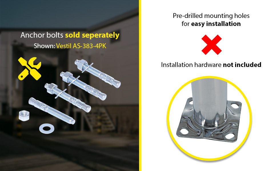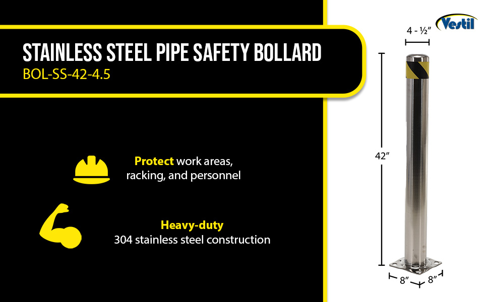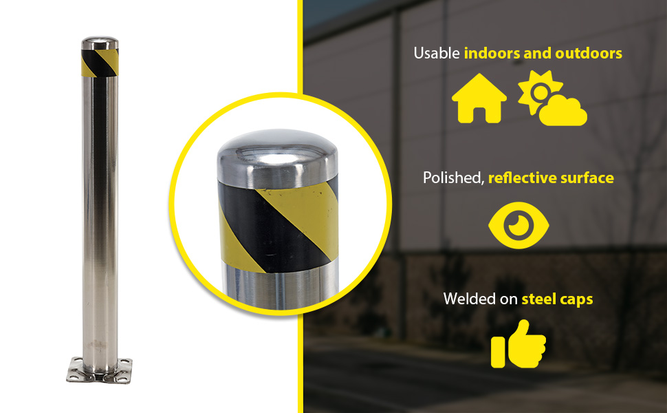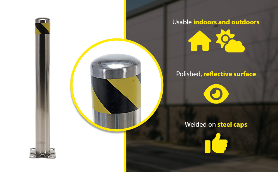 Bollards can be used both indoors and outdoors to protect work areas, racking and personnel. Steel caps are welded on. Base plate measures 8" x 8" and includes four (4) pre-drilled mounting holes. Mounting kits available. 304 stainless steel polished finish.
