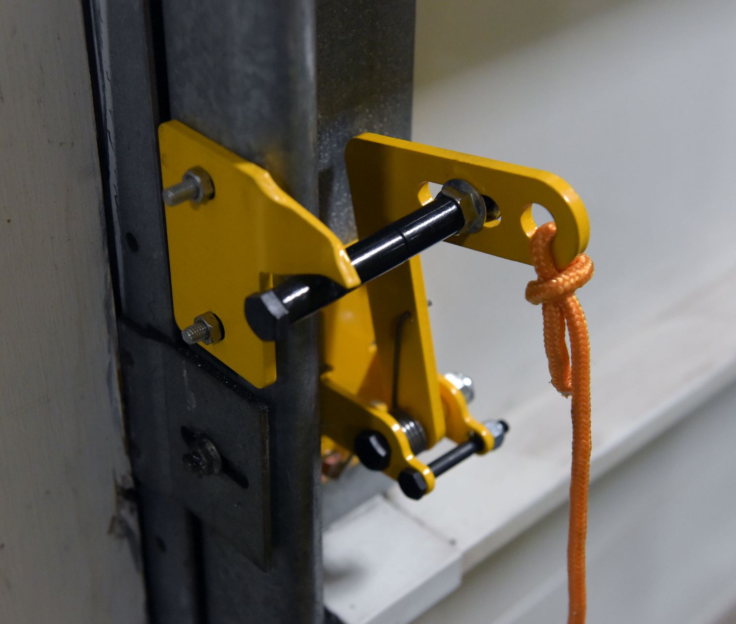 Unique product will allow overhead doors to be locked in virtually any up position. Automatically locks doors in full up position or in the closed position. Prevents the overhead door from unexpectedly "slamming down". Protects personnel, product, and equipment. Spring-loaded locking latch is released by pulling rope (included). Simply bolts to any overhead door (installation hardware is not included). Includes two reversible "locking plates" that may be mounted anywhere along door track. Steel construction with yellow baked in powder coated toughness.