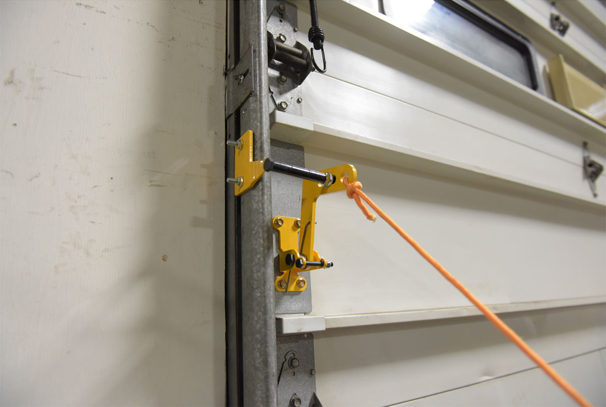 • Spring-loaded locking latch is released by pulling rope & simply bolts to any overhead door