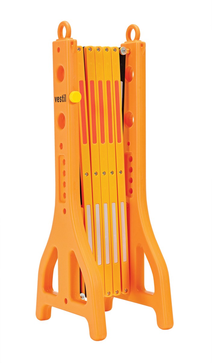 Model PEXGATE is constructed of heavy-duty molded yellow and black plastic. One side of gate includes reflectors for better visibility. End pieces are hollow and may be filled with liquid for added weight. Assembly required.