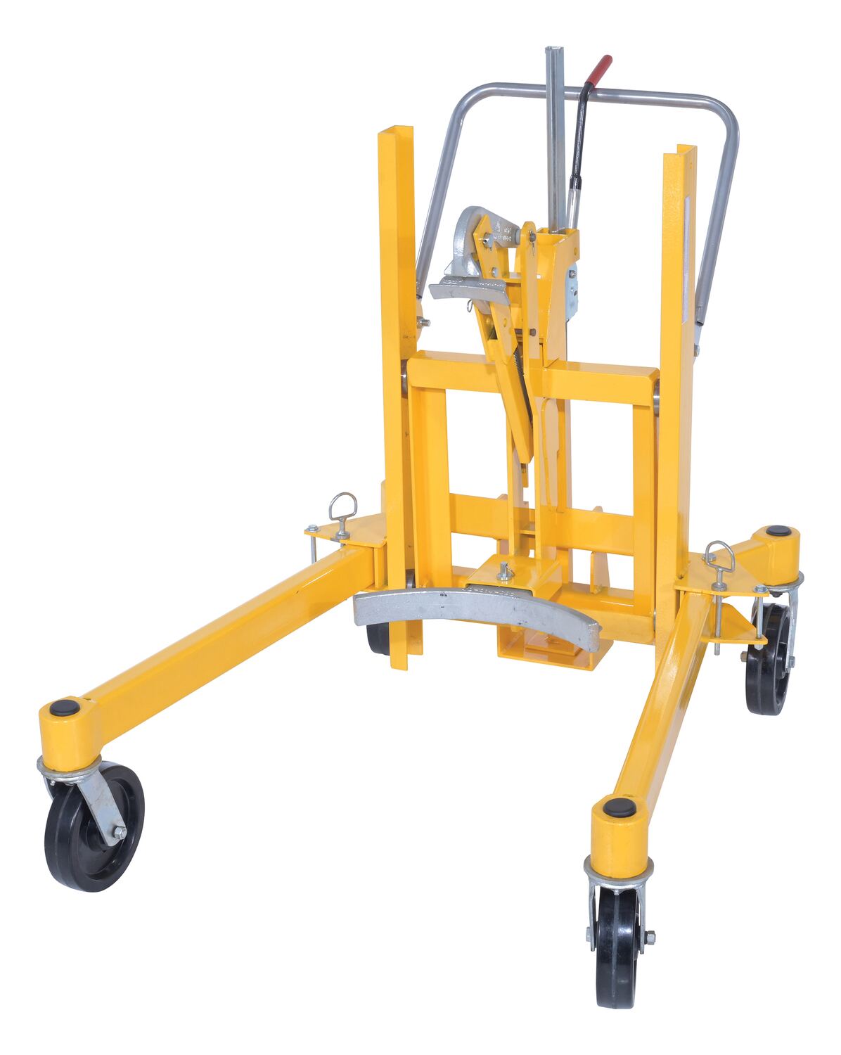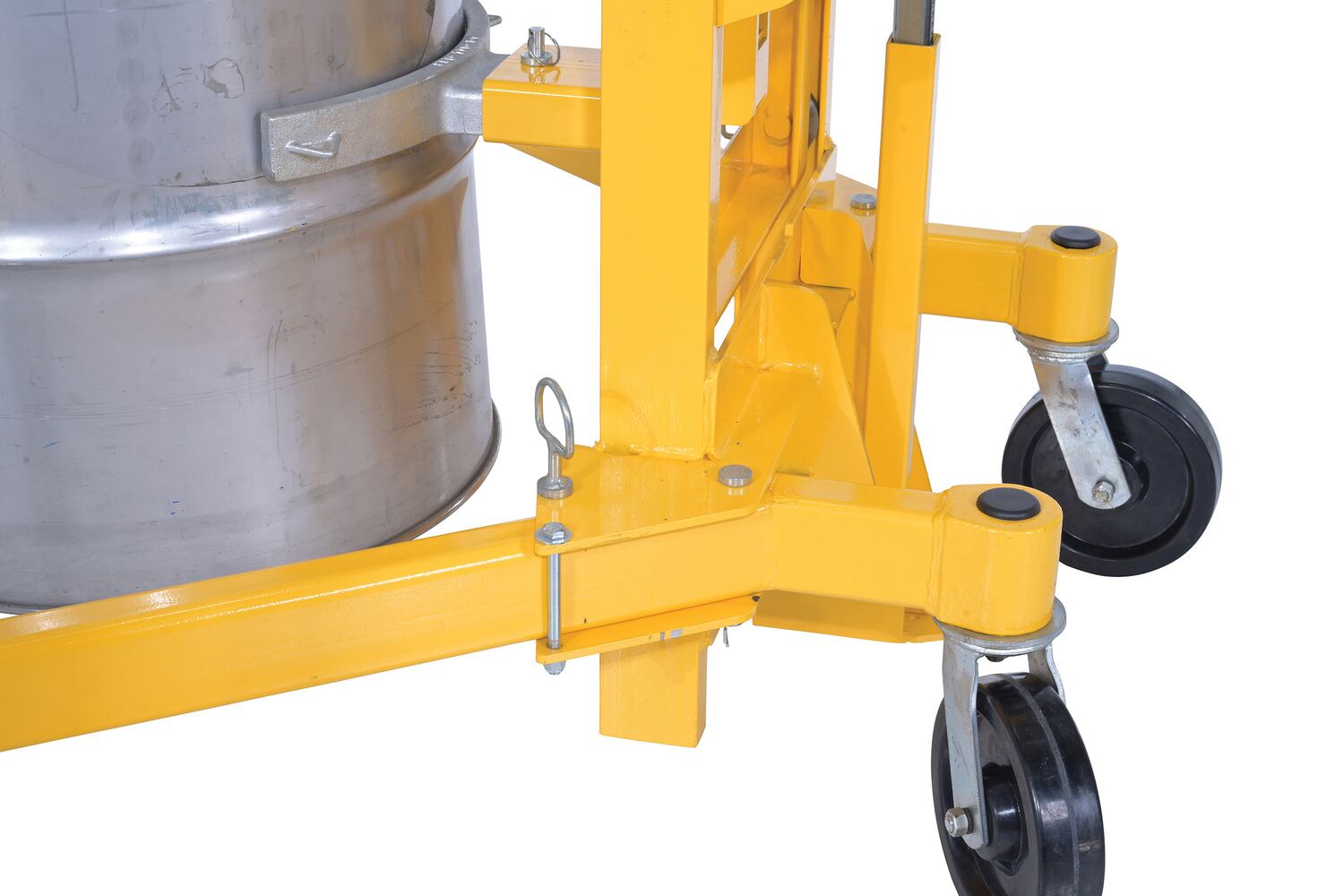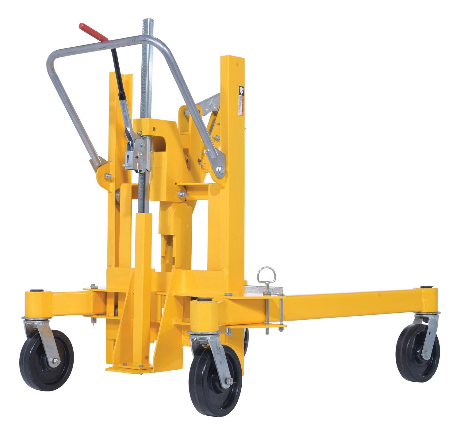 Unique portable unit designed to lift and transport steel, plastic, and fiber drums with a top lip. Steel jaw securely grips the top lip of the drum. Available with either a manual mechanical ratchet, foot pump hydraulic, or DC powered lift mechanism. Straddle legs rotate for access to drums on pallets. Units roll on four (4) 8" x 2" phenolic swivel casters. The push handle folds down for easy access to ratchet and foot pump. All welded steel construction. Baked-in powder coated toughness with a safety yellow finish. Optional scale weighs drums to an accuracy of +/-0.5 pounds. Optional scale includes (6) AA cell batteries and an AC adaptor.