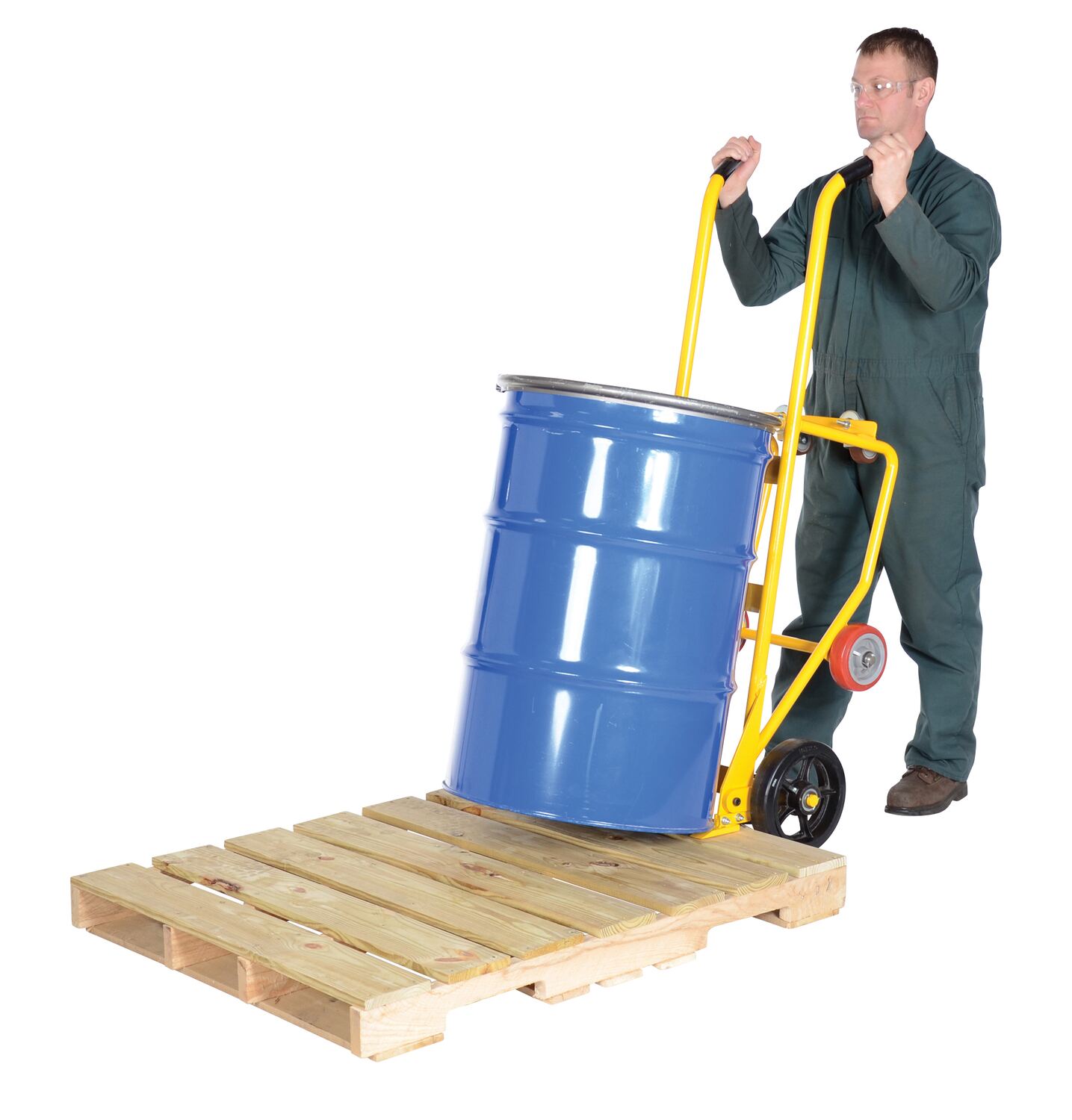 One of the most versatile drum trucks in the industry. This innovative product allows the operator to easily tip back the truck in order to transport drums ergonomically on four wheels. Unit doubles as a drum cradle for storage and dispensing all in one. Top angle is 3 degrees when used as a Drum Cradle. This unique design also allows the operator to place drums and retrieve off of a pallet. Accommodates 55-gallon steel, plastic, or fiber drums. Rolls smoothly on a variety of (2) 10" x 2-1/2" wheel types (see table below), (2) 6" x 2" poly-on-poly wheels, and (2) 3" x 1-1/4" poly-on-poly swivel casters. Standard with a wheeled undercarriage that positions the drum horizontally for drainage or storage. The drain height is 12-13/16" high in the cradle position. An integral self-storing bung wrench is standard. This attractive feature not only opens numerous drums, but helps to keep the drum snug on the truck. A yellow baked in powder coat finish for added toughness. Optional drip pan available.