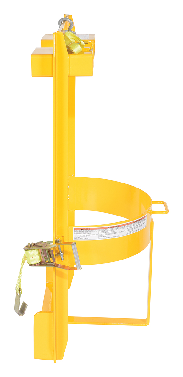 This Overhead Drum Lifter is designed for lifting drums with an overhead crane or similar lifting device. Integral fork pockets are also included for transportation with forklift. Safety restraint included. Steel saddle is designed for use with 30 and 55 gallon steel, plastic, and fiber drums with a maximum diameter of 24-5/8". Unit comes complete with a ratchet strap for securely holding the drum in place. With a non-tilting style, this lifter is made for straight vertical lifting only. Features a durable yellow baked-in powder-coated toughness.