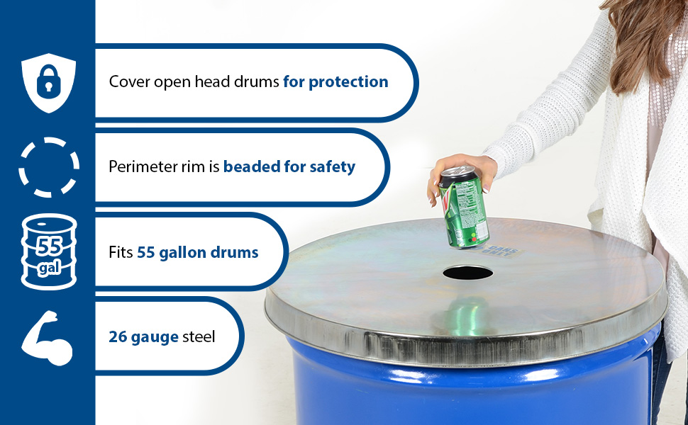 Galvanized Steel Drum Covers [Prop 65 Warning] for 55 gallon drums. Manufactured from 26 gauge galvanized steel. Cover drum tops for added protection. Perimeter rim is beaded for safety.