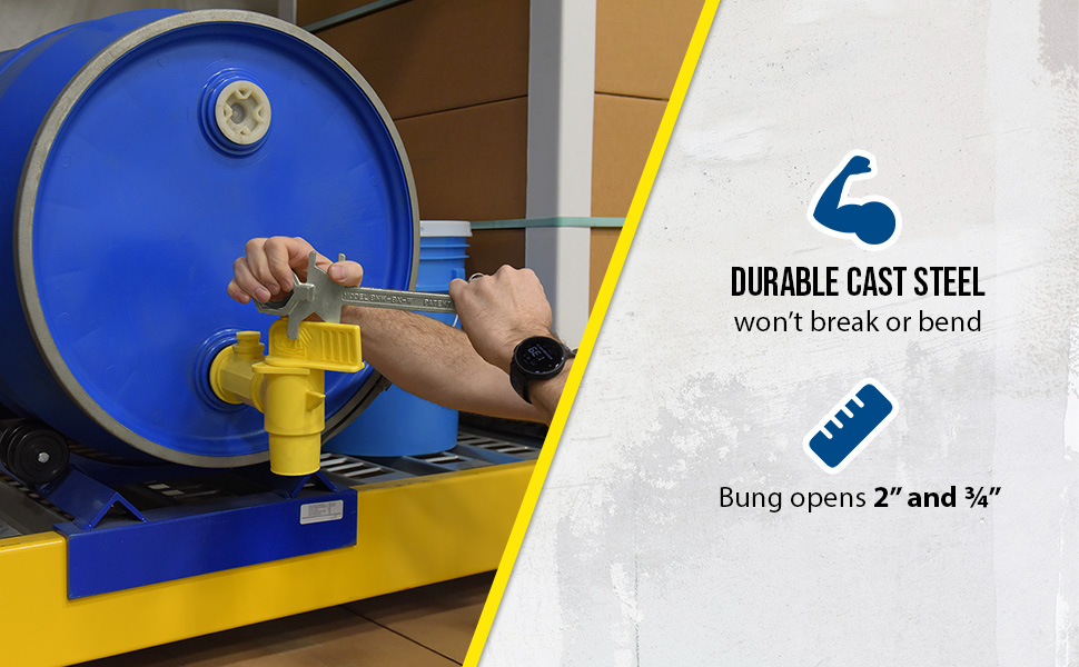 Specialty Bung Nut Wrenches are available in cast steel with polished zinc finish, non-sparking aluminum or non-sparking bronze alloy to meet many applications. These multipurpose drum tools not only open and close drum bungs or plugs, they also work as a bung wrench, ring wrench and faucet wrench all in one! Wrenches are universal in which they fit all types of industrial drum plugs and bungs in metal or plastic. The angled handles on model BNW-I-W and BNW-B-W protect knuckles in most positions. Durable cast steel does not bend, break or chip. Eliminate the need for extra tools with these multifunctional drum wrenches! Patent pending.