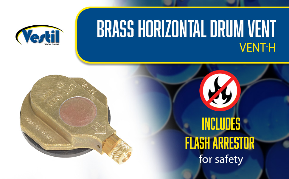 VENT-H and VENT-V are two styles available for use with drums in horizontal or vertical positions. Use with standard 2" drum plug openings. Each vent includes a flash arrestor for safety. Brass construction.