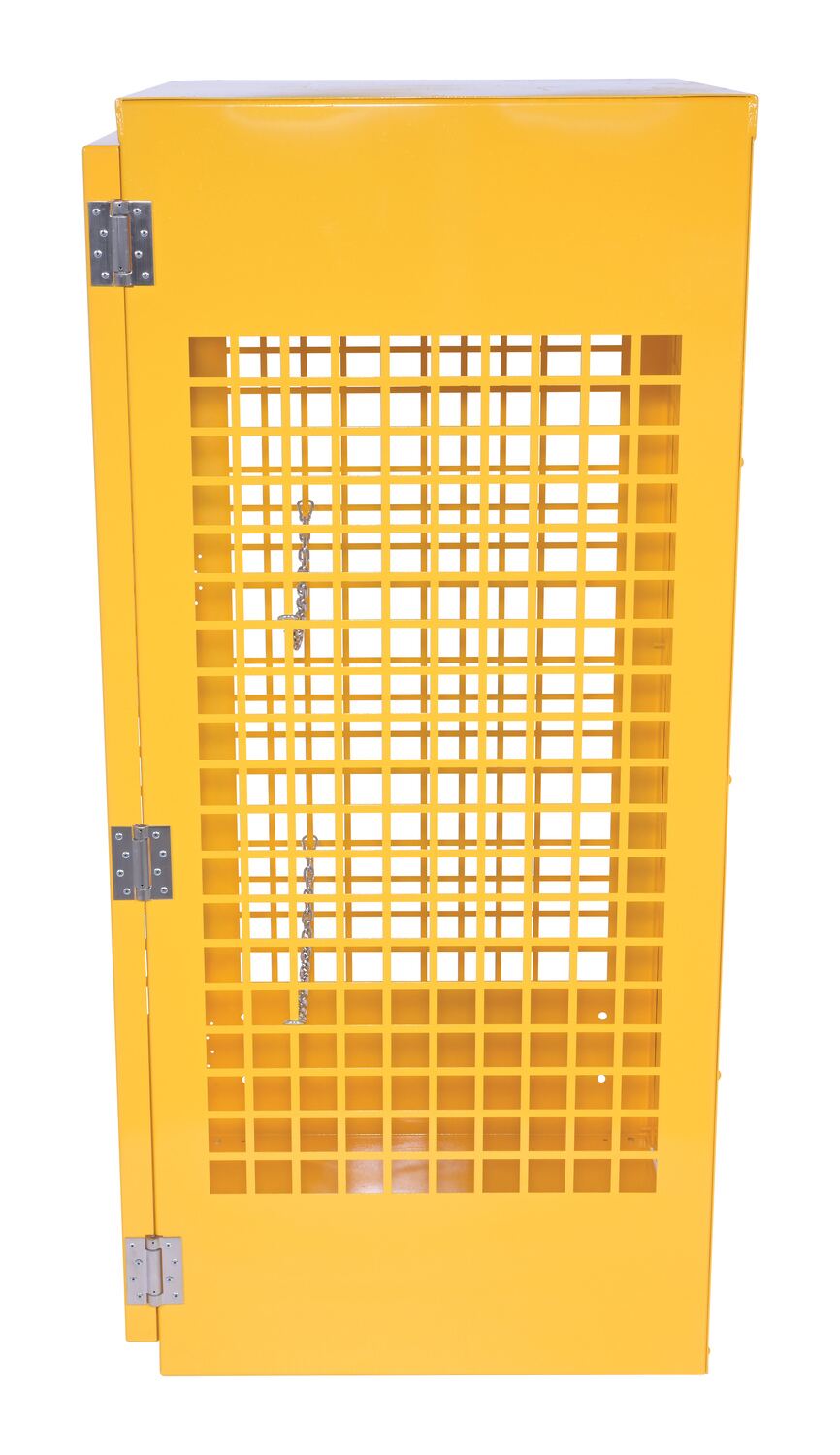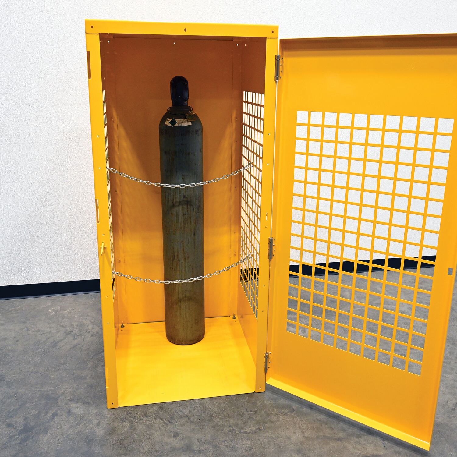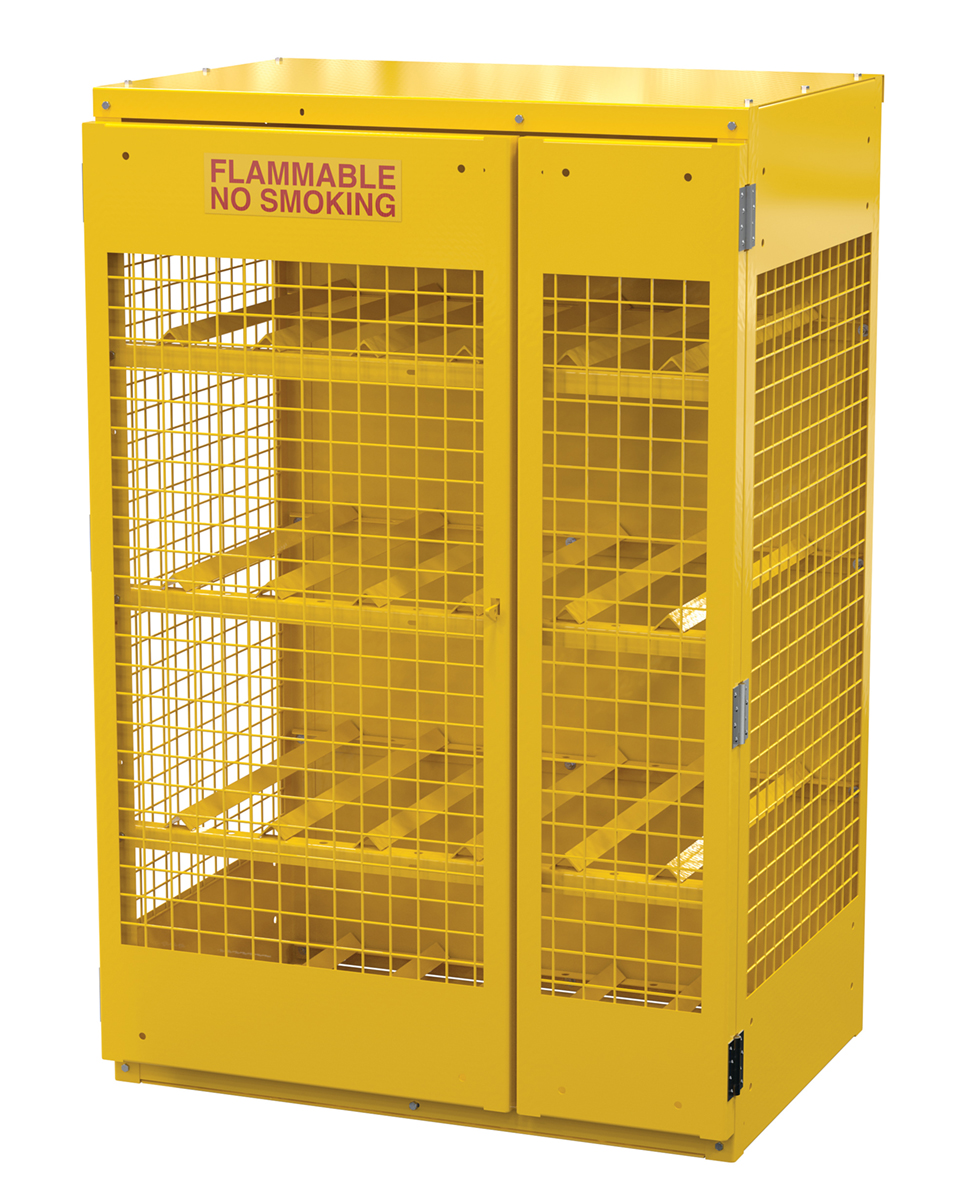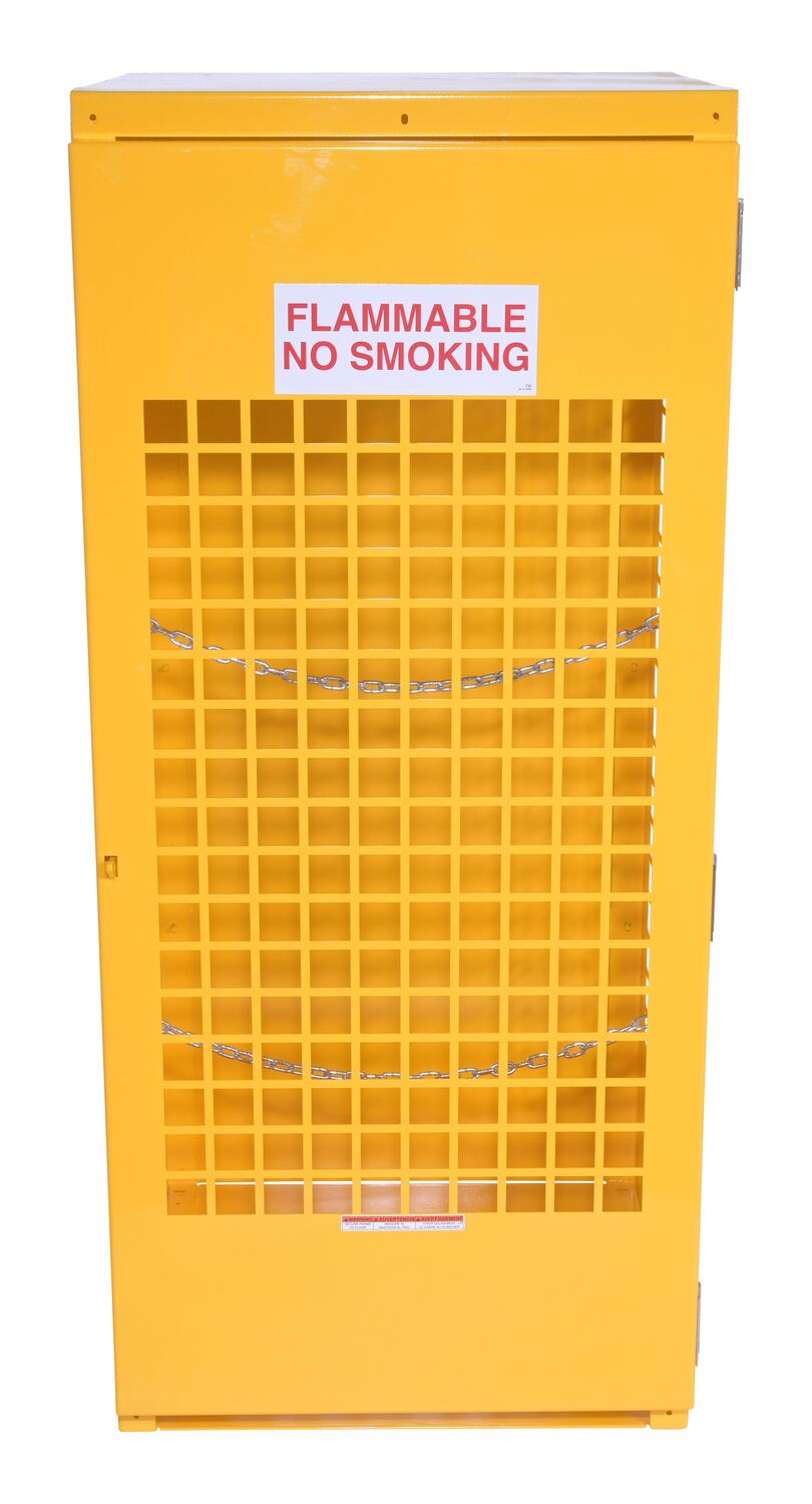 Steel cabinets for storage of cylinders. Cylinder storage capacity is based on cylinder size. Sides are made of expanded steel for an open view design. The top, back, and bottom is made of solid sheet steel. Lockable doors protect cylinders (padlock not included). Base includes lag holes for securing cylinders. Vertical units include chains for securing cylinders. Includes red lettered signage noting "Flammable-No Smoking" contents. Meets OSHA 1910.110 (f)(6)(ii), ANSI NFPA 55 + 58 and CGA P-1 design standards. Rugged steel construction with a baked-in powder coated safety yellow finish for toughness.